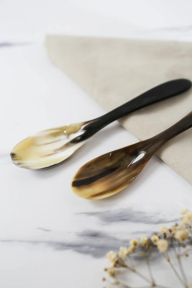 ช้อนเขาควายธรรมชาติ ทำด้วยมือและขัดเงา เหมาะสำหรับเสิร์ฟเครื่องเทศ น้ำจิ้ม หรือใช้ตกแต่งโต๊ะอาหาร คุณภาพสูง