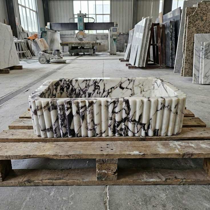 อ่างล้างหน้าหินอ่อน Calacatta Viola ธรรมชาติทรงไม่สมมาตร ดีไซน์ทันสมัย พร้อมแผ่นกันน้ำและที่ระบายน้ำ สำหรับใช้ในคลังสินค้า