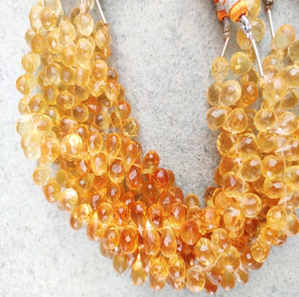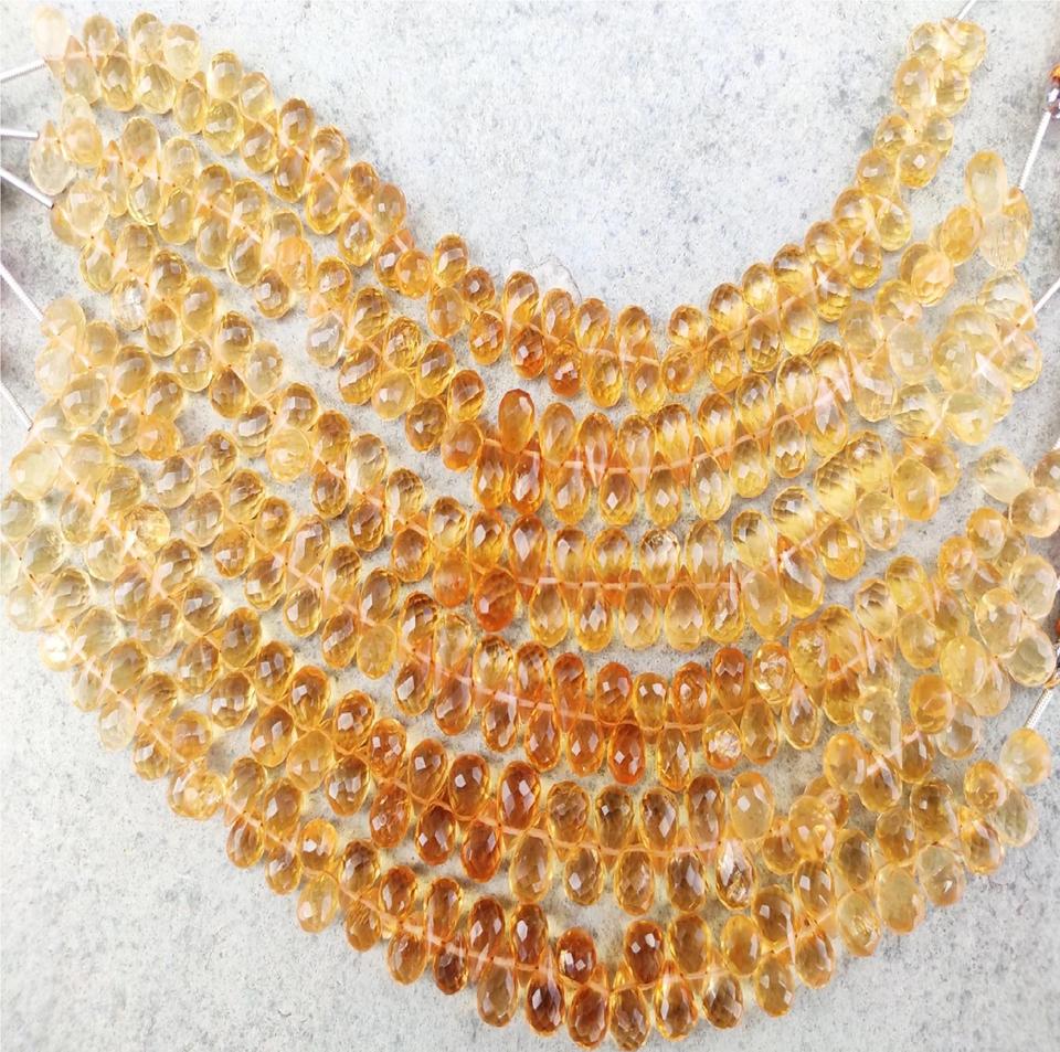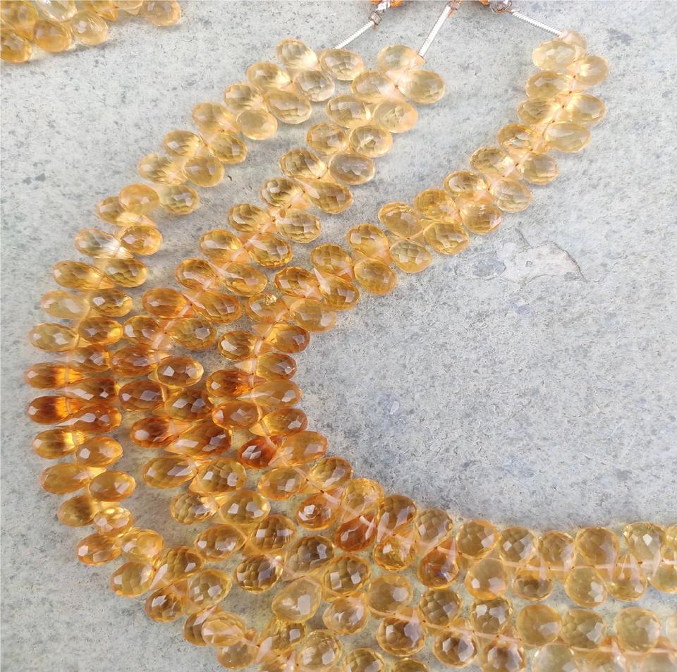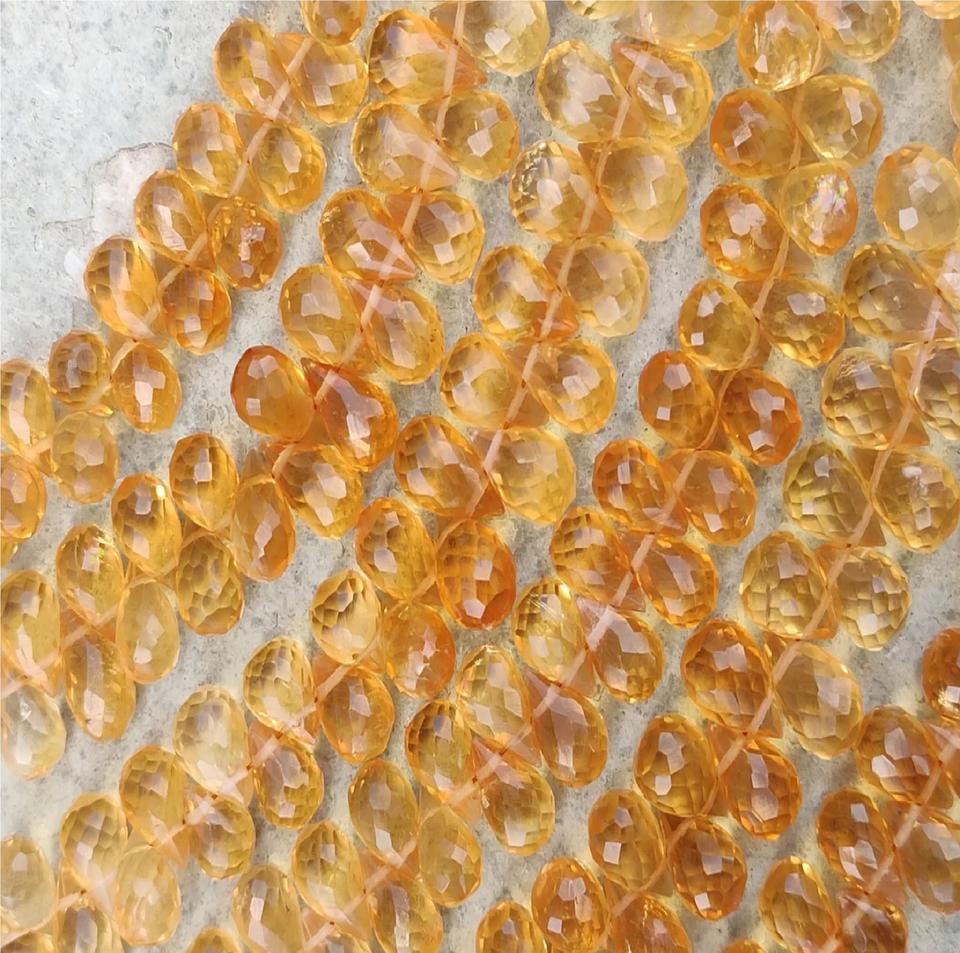 ลูกปัดควอตซ์ซิทรินสีเหลืองธรรมชาติขายส่ง รูปทรงหยดน้ำเจียระไนแบบบริโอเล็ต ตัดด้านข้าง พลอยหลวม Coszcatl Exports Third