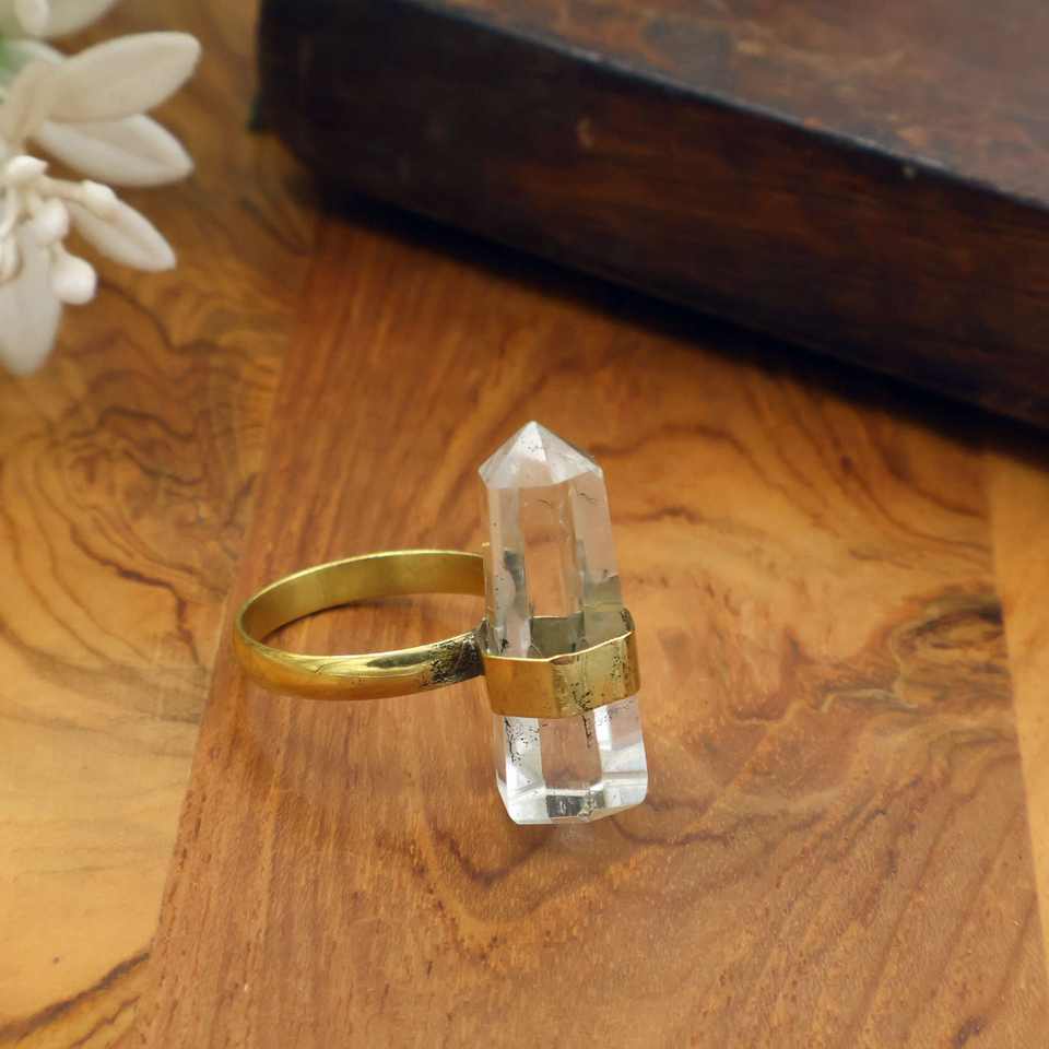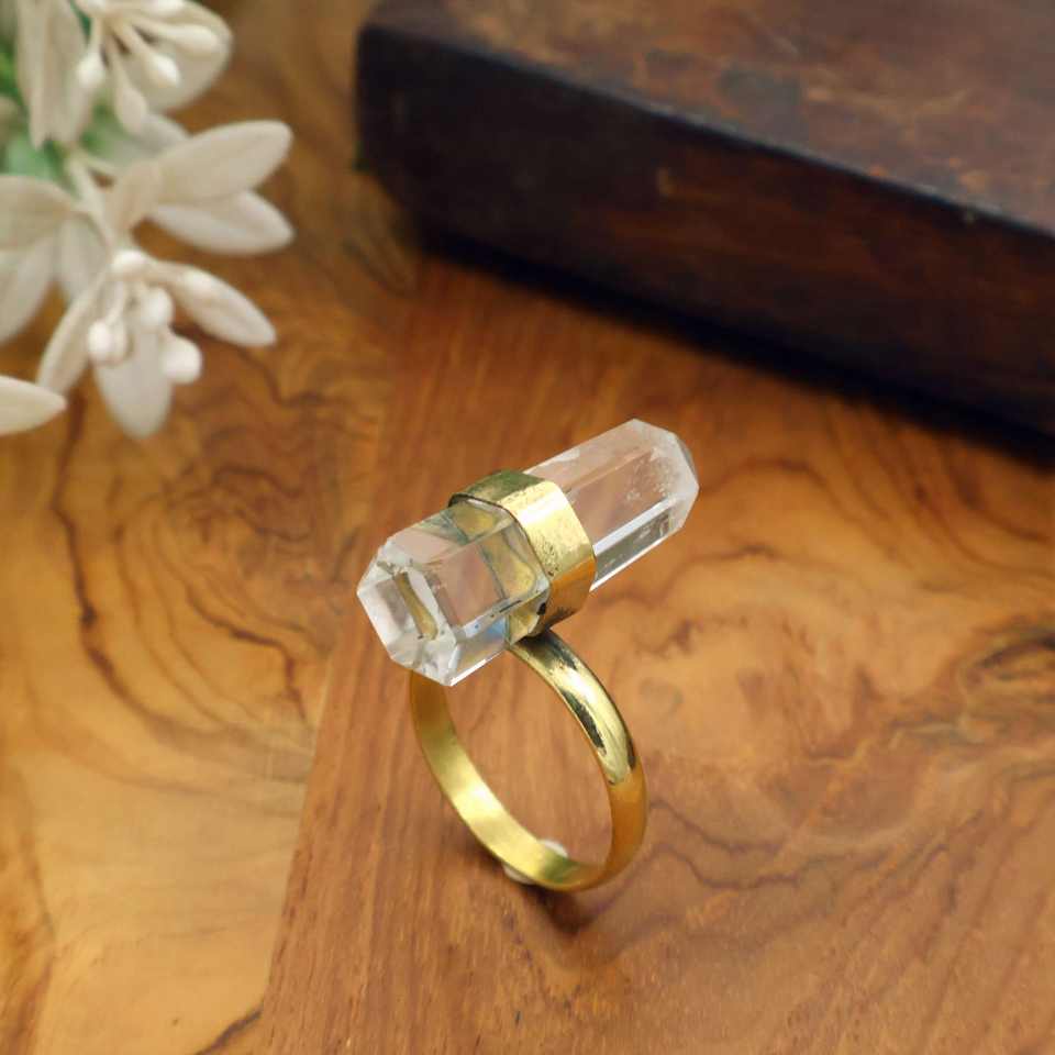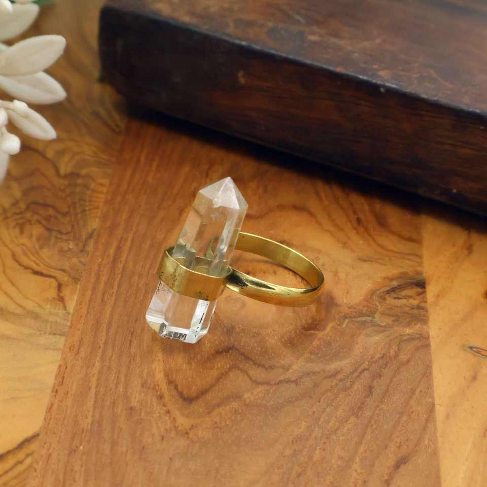 แหวนคริสตัลควอตซ์ใสธรรมชาติ ชุบทอง ปรับขนาดได้ แหวนดีไซน์โดดเด่น ทำด้วยมือ เครื่องประดับหินบำบัด