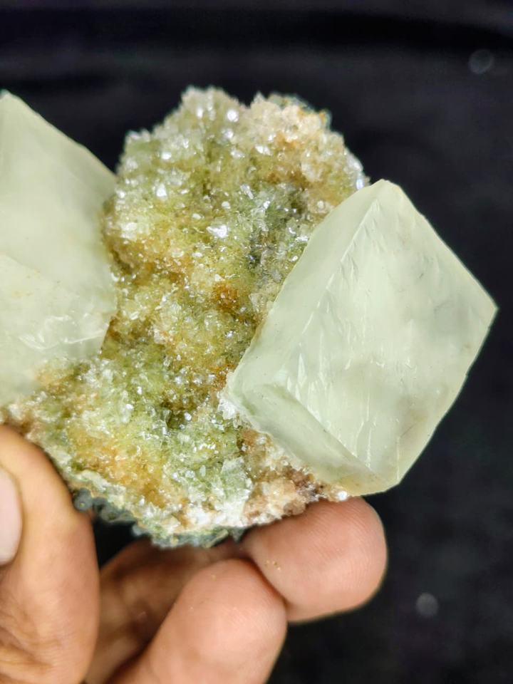 แคลไซต์เคลือบธรรมชาติพร้อมกลุ่มคริสตัลสีเขียวคาลซิโดนี ตัวอย่างแร่พรีเมียม หินบำบัด คุณภาพสำหรับสะสมและตั้งโชว์