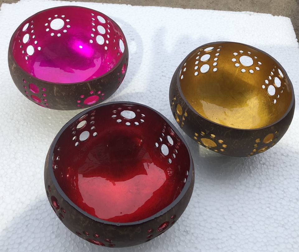 Natural Coconut Bowl Eco-Friendly Handmade Coconut Shell Bowl Decorative Carved Candle Holder with Colorful Lacquer Finish