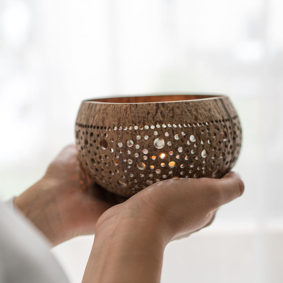 ผู้ถือเปลือกมะพร้าวธรรมชาติสำหรับเทียนและดอกไม้เปลือกต้นมะพร้าวปาล์มเทียนผู้ถืองานแต่งงาน