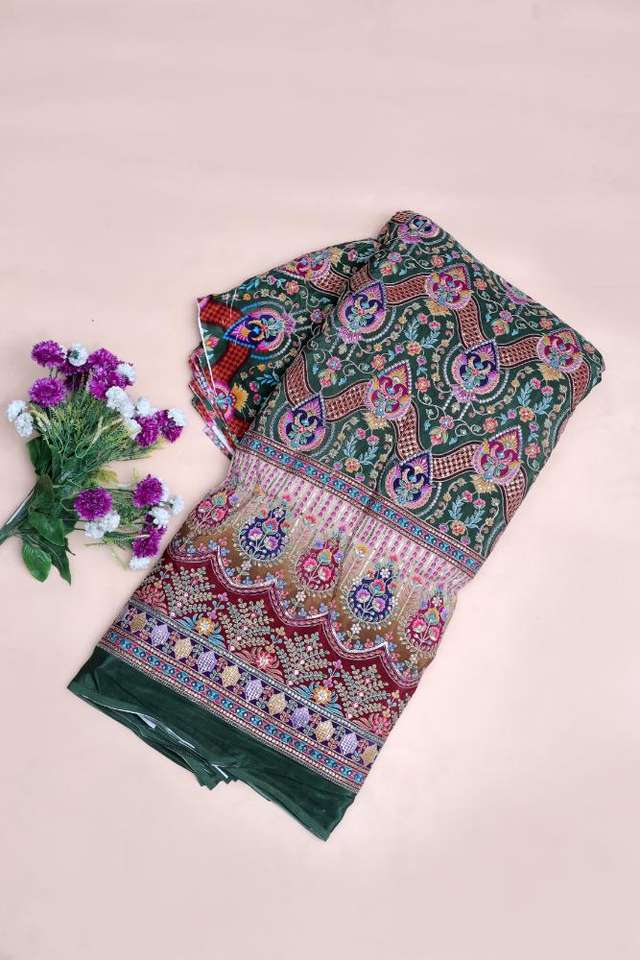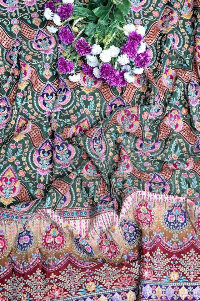 ผ้าพิมพ์ลายดอกไม้เรขาคณิตสีเขียวขวดแบบธรรมชาติพร้อมขอบตกแต่งสำหรับทำชุดคุर्ติ วัสดุสำหรับตัดเย็บเสื้อผ้าชาติพันธุ์