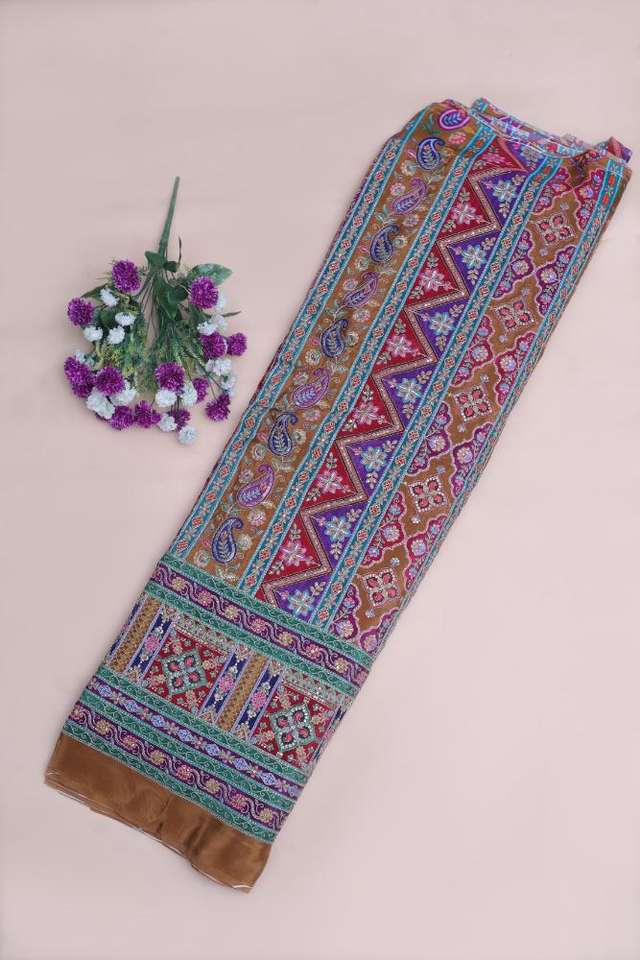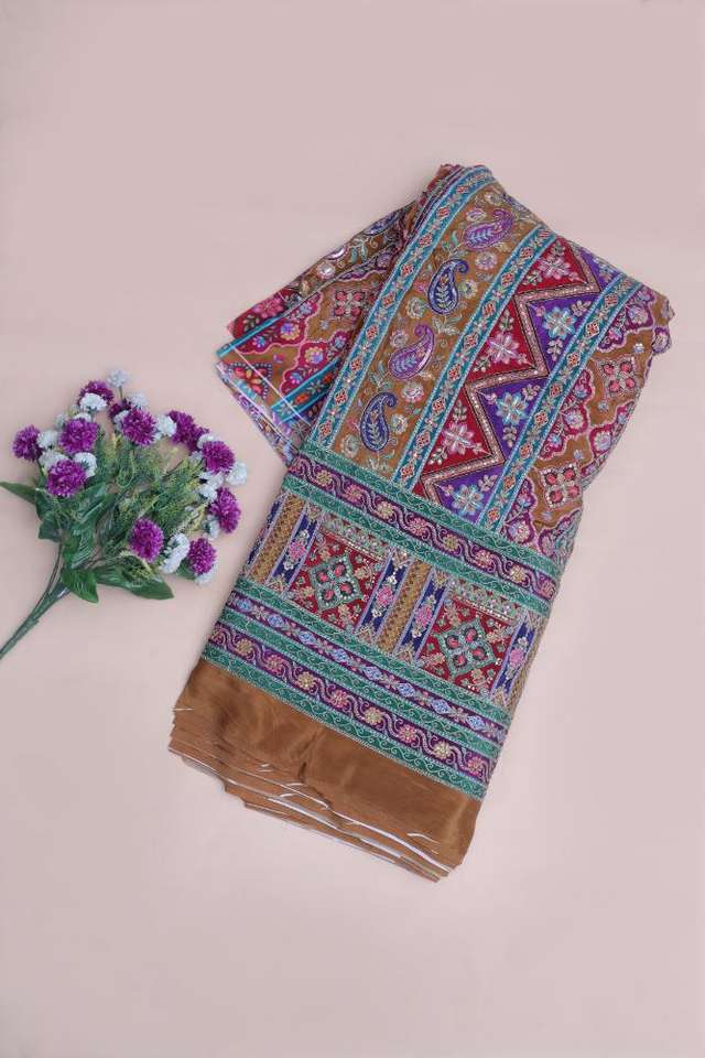 ผ้าเครปสีน้ำตาลอูฐลายพิมพ์เรขาคณิตสไตล์ชาติพันธุ์พร้อมขอบลายเพสลีย์สำหรับตัดเย็บชุดคุर्ติ