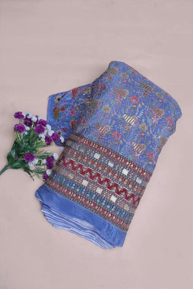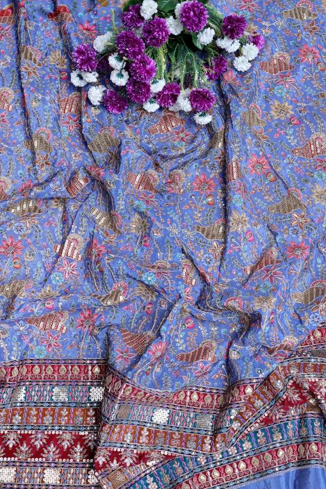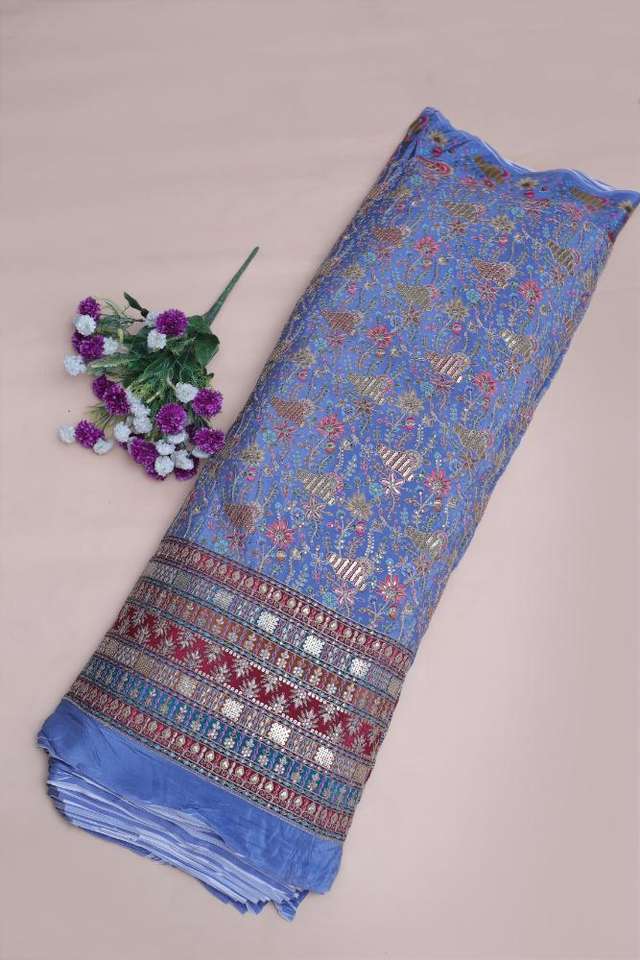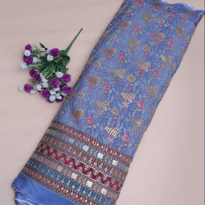 ผ้าพิมพ์ลายดอกไม้สีน้ำเงินครีปธรรมชาติ พร้อมขอบตกแต่งอย่างสวยงาม เหมาะสำหรับทำชุดคุรติ ผ้าสำหรับชุดพื้นเมือง