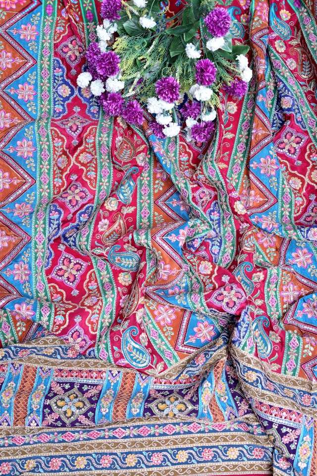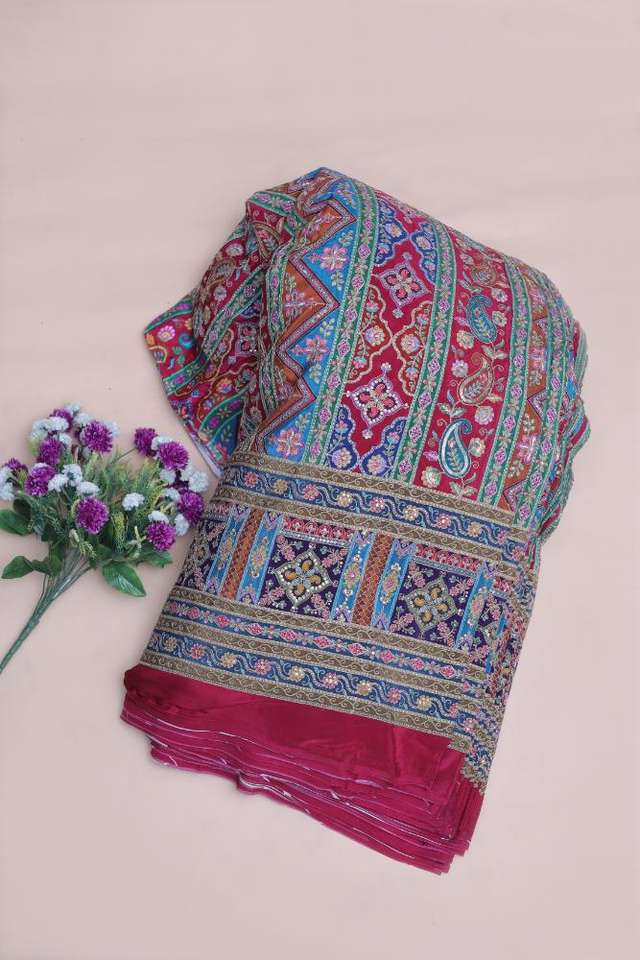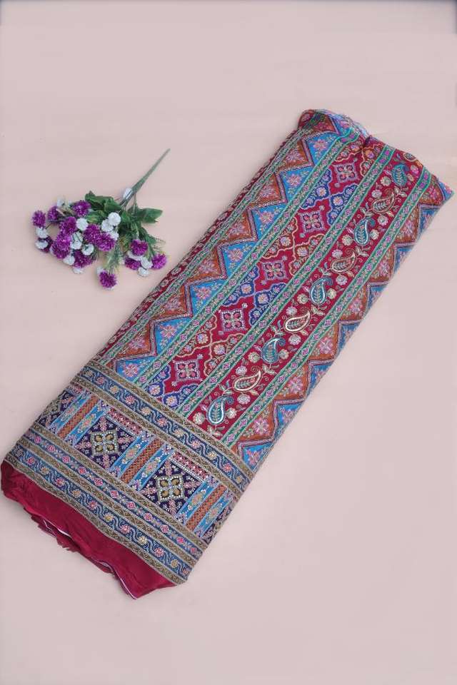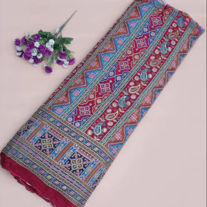 ผ้าเครปสีชมพูธรรมชาติ ลายพิมพ์เรขาคณิตสไตล์ชาติพันธุ์ พร้อมขอบลายเพสลีย์ สำหรับตัดเย็บชุดคุर्ติ