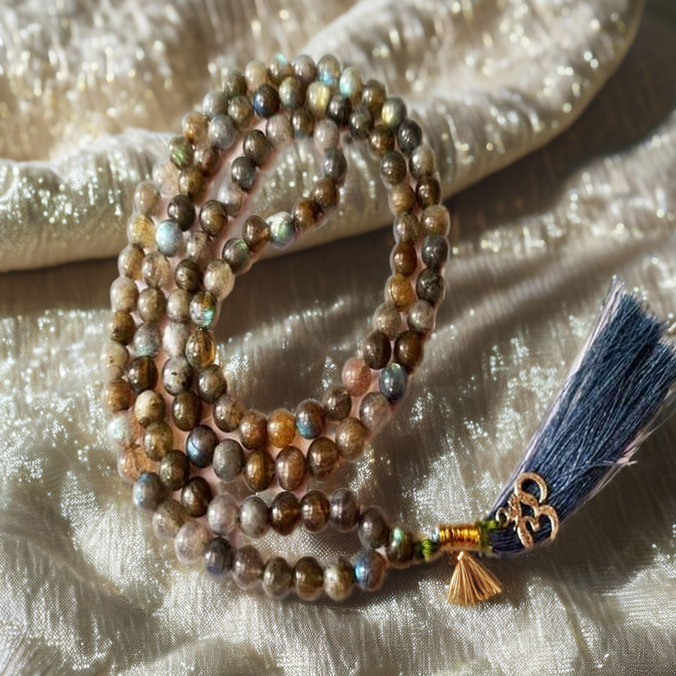 ลูกปัดคริสตัลธรรมชาติแกะสลัก labrodolite 8มม. JAP Mala พร้อมเครื่องรางเงินพลอย JAP Mala สร้อยคอลูกปัดสำหรับการรักษา