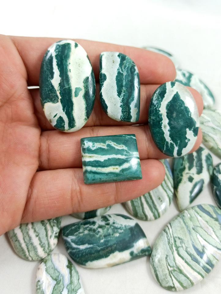 คริสตัลธรรมชาติ ริเวอร์แจสเปอร์ คาโบชอง พลอยหลวม สีเขียว-ขาว หลังแบน สำหรับทำเครื่องประดับ รูปทรงผสม ขายส่งจำนวนมาก