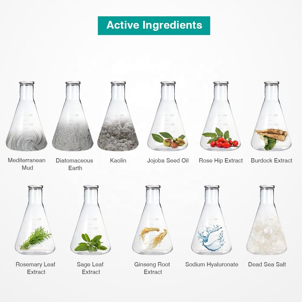 กลีเซอรีน, เกลือทะเลที่ตายแล้ว, น้ำใบว่านหางจระเข้ Barbadensis, ดินขาว, เกลือทะเลเมดิเตอร์เรเนียน, น้ำมันเมล็ดโจโจ้บา, สควอเลน, สารสกัดจากฮ็อพ, สารสกัดจากหญ้าเจ้าชู้, สารสกัดจากใบโรสแมรี่, สารสกัดจากใบเสจ, สารสกัดจากโสม, โซเดียมไฮยาลูโรเนตส่วนผสมหลัก
