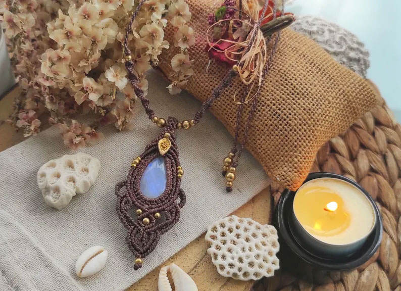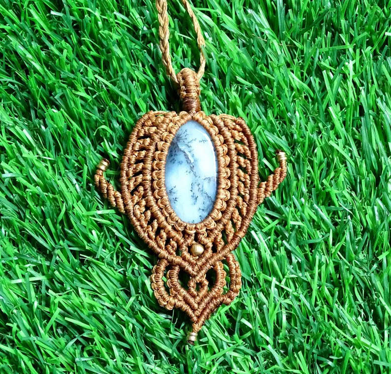 สร้อยคอหินอาเกตธรรมชาติแบบเดนไดรติก พร้อมจี้หินอาเกตแบบถักมาคราเม่ ดีไซน์จากธรรมชาติ สไตล์โบโฮ