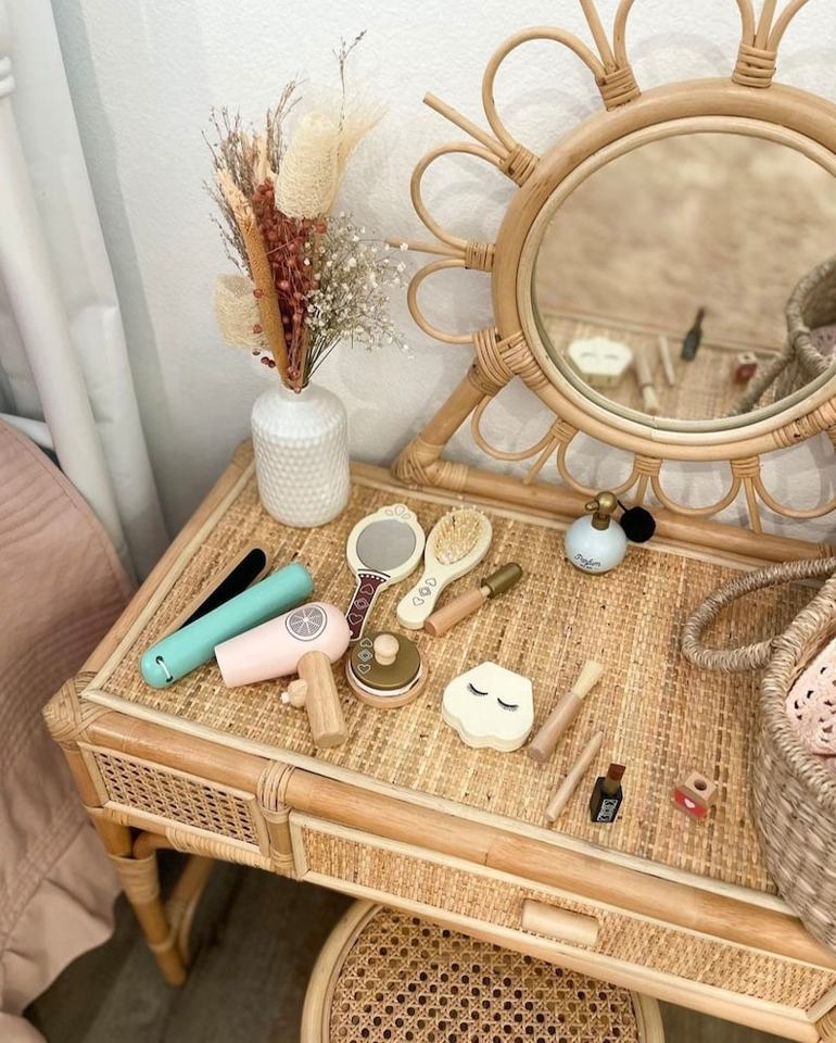 โต๊ะเครื่องแป้งหวายออกแบบตามธรรมชาติพร้อมกระจกเดซี่แบบถอดได้และสตูลฟางสําหรับตกแต่งเด็กตกแต่งบ้าน