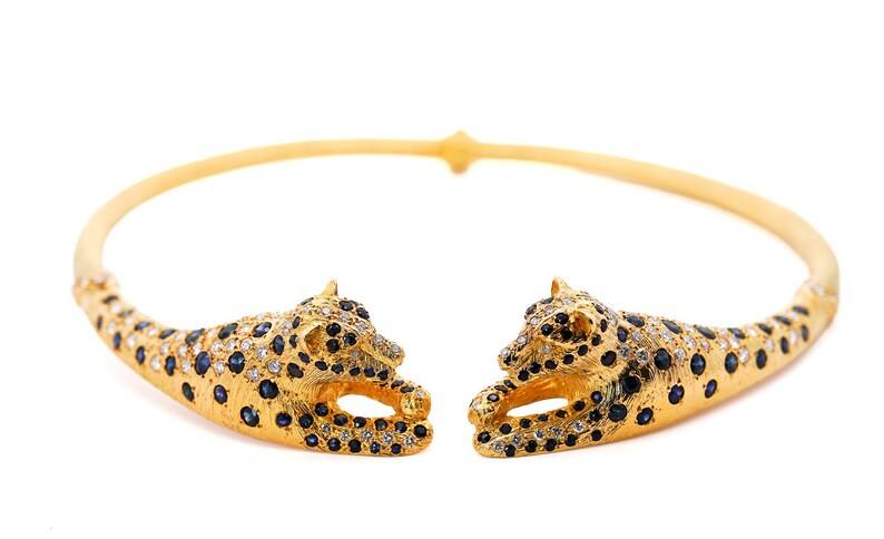 18K แข็งแข็งแท้สีเหลืองทองเสือดาวโชคเกอร์สำหรับผู้หญิงเพชรธรรมชาติและแซฟไฟร์ชุบทองโลหะผสมสังกะสีเครื่องประดับแฟชั่น