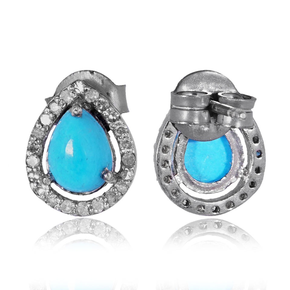 ต่างหูเพชรแท้ทรงลูกแพร์ประดับเทอร์ควอยซ์ ชุบเงินแท้ 925 แบบกดติด ทำด้วยมือ งานละเอียด ขายส่ง