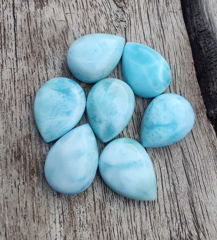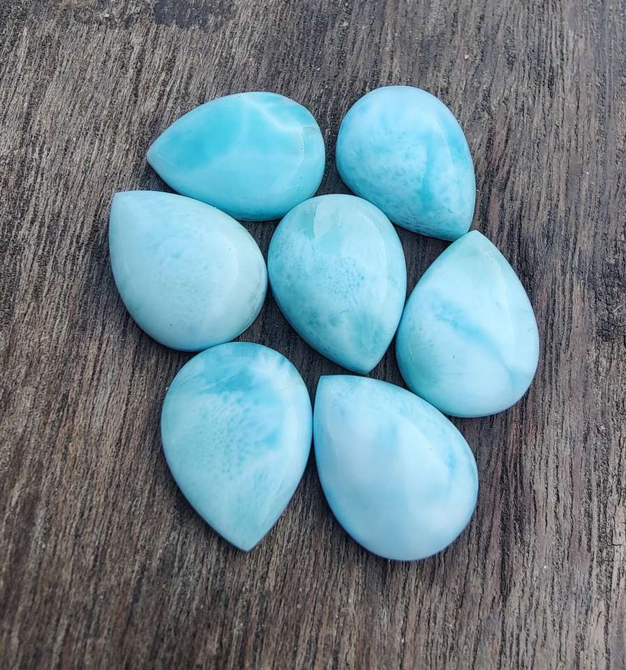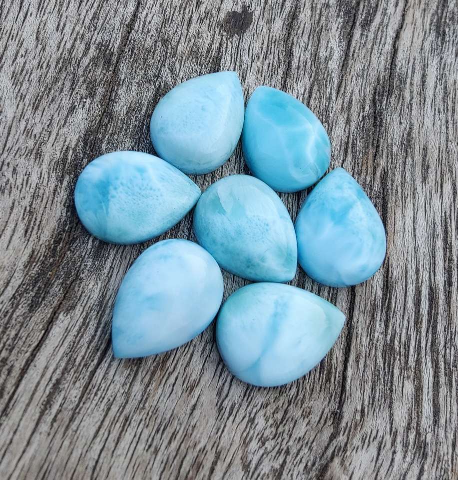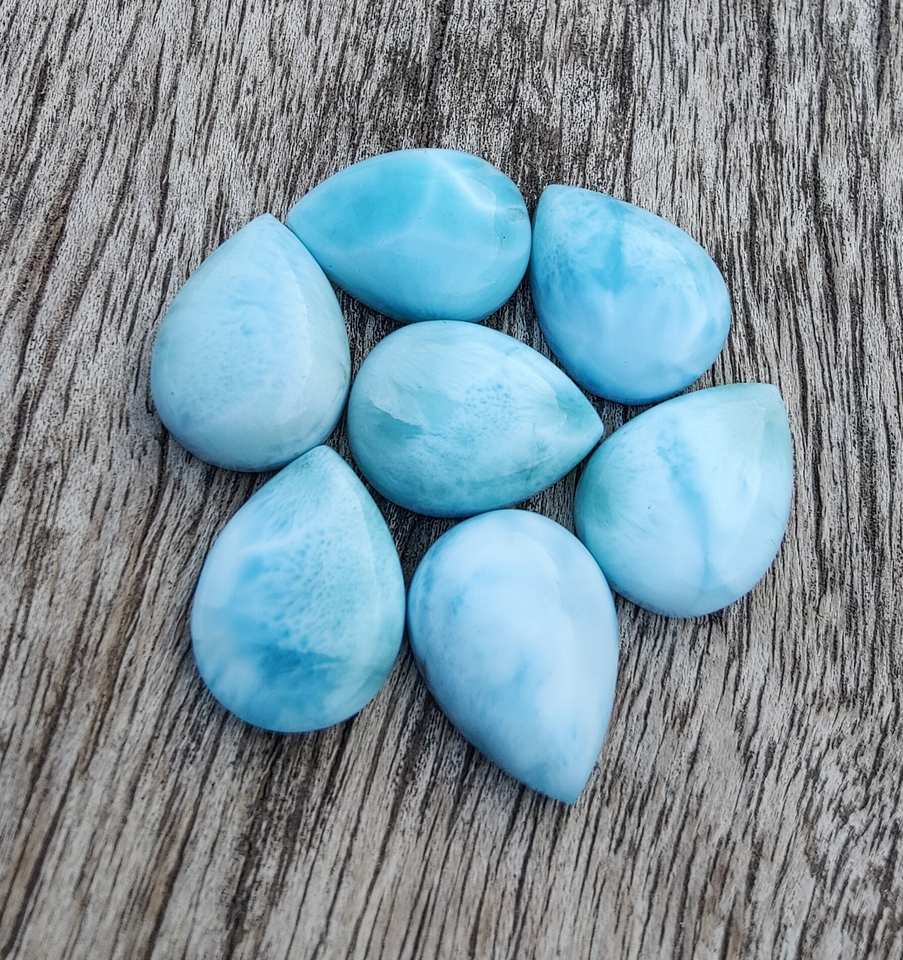 พลอยลาริมาร์สีน้ำเงินธรรมชาติจากโดมินิกัน รูปทรงลูกแพร์ คุณภาพสูง แบบหลังแบน มีขนาดที่ปรับเทียบไว้แล้วสำหรับทำเครื่องประดับ