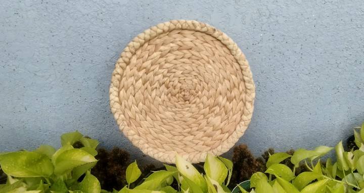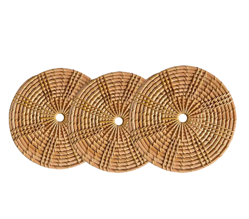 แผ่นรองจานหวายและที่รองจานหวายเป็นมิตรกับสิ่งแวดล้อมธรรมชาติทำมือสำหรับตกแต่งโต๊ะรับประทานอาหารขนมปังผลไม้และหม้อชา
