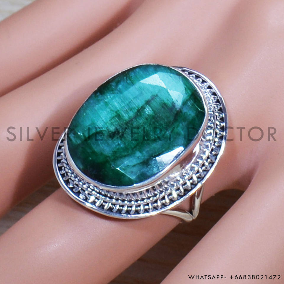 แหวนพลอยมรกตธรรมชาติ925แหวนเงินรูปวงรีทรงสดใสทำด้วยมือปรับได้ง่าย
