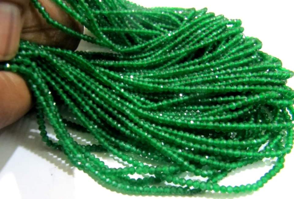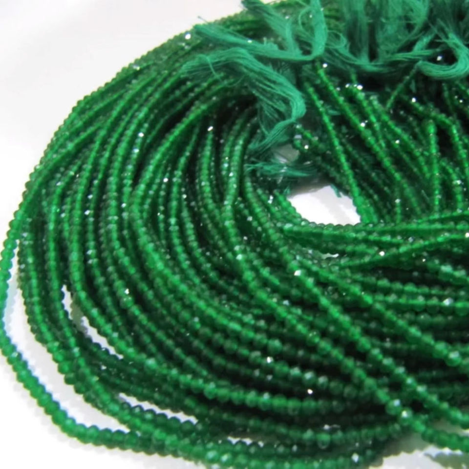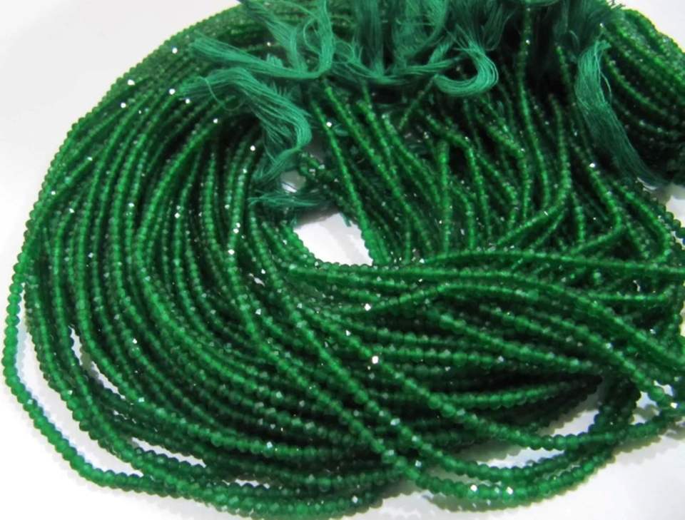 ลูกปัดมรกตสีเขียวทรงรอนเดลล์ขนาด 2 มม. ผลิตในห้องปฏิบัติการ แบบไมโครเฟเชต ร้อยเป็นสายยาว 13 นิ้ว สำหรับทำเครื่องประดับ