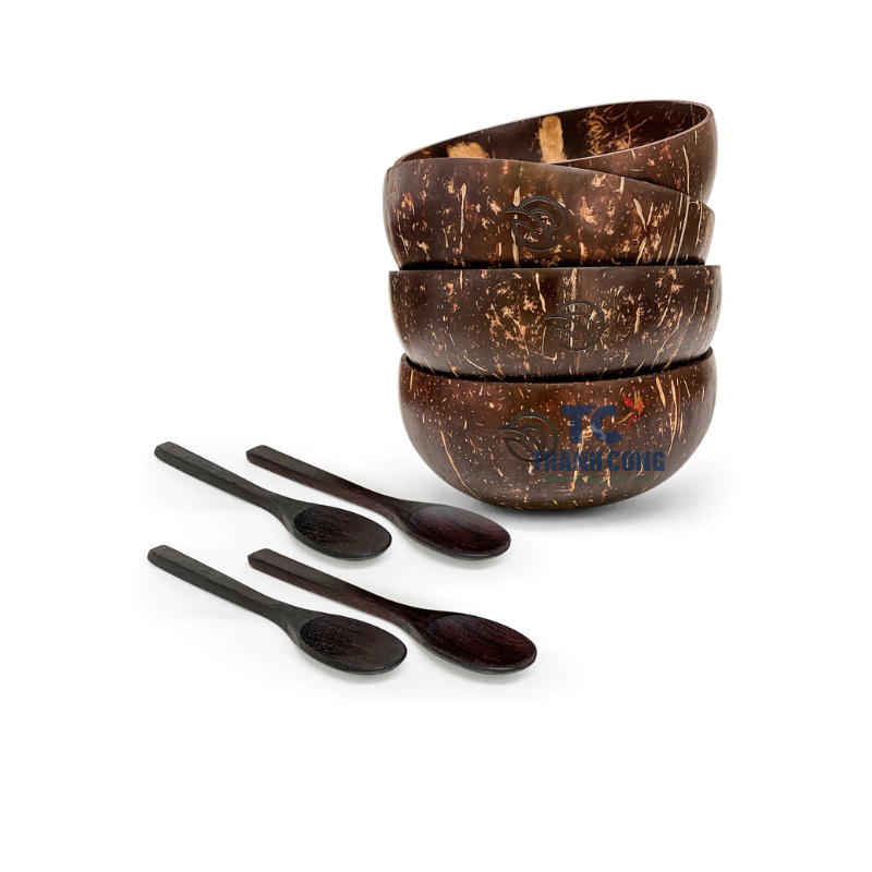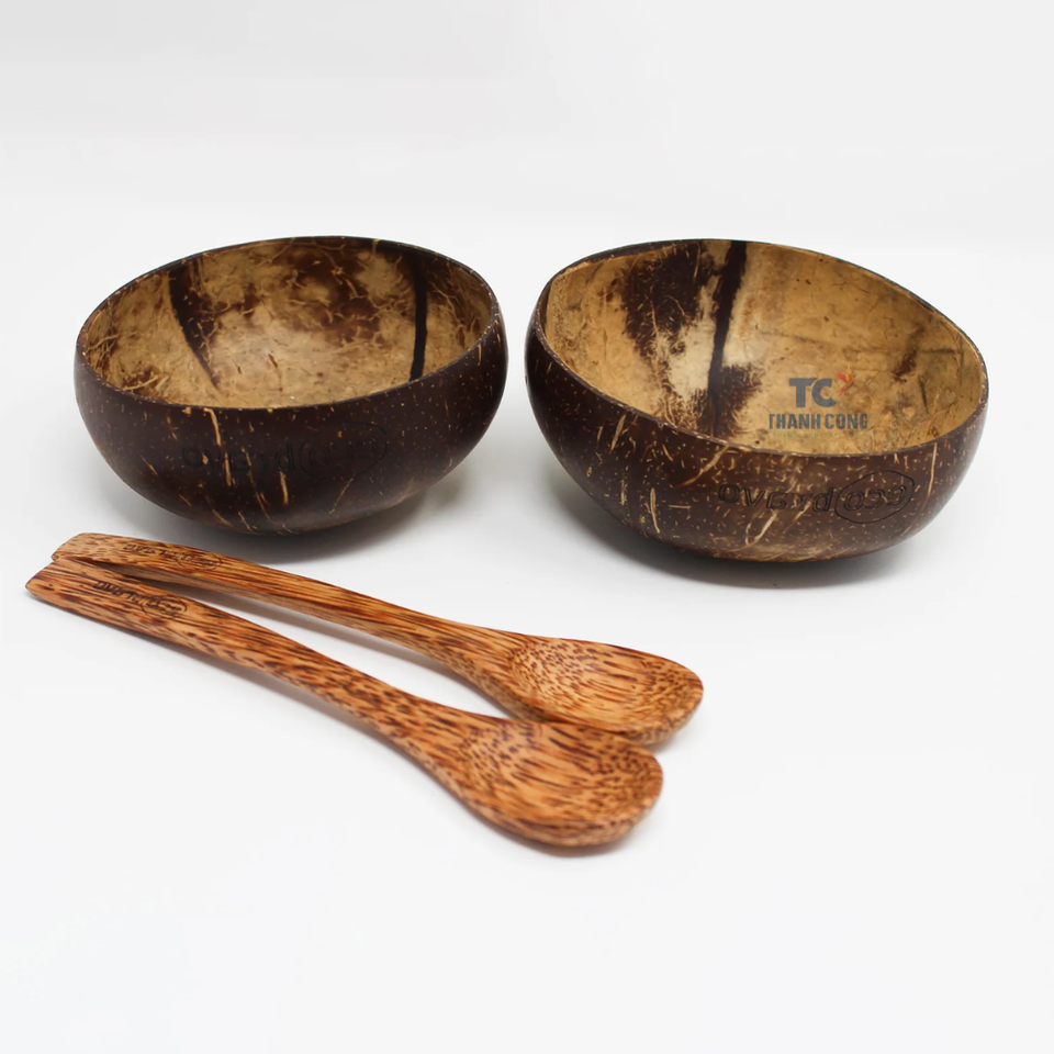 ชุดชามและช้อนชามมะพร้าวทำจากไม้ไผ่แกะสลักธรรมชาติกะลามะพร้าว