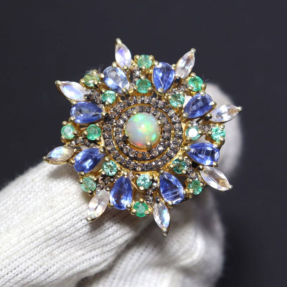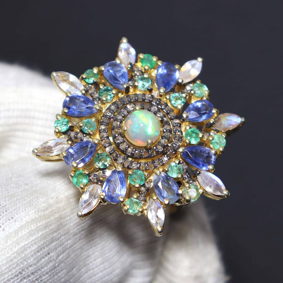 แหวนแต่งงานพลอยโอปอลเอธิโอเปียธรรมชาติ มรกต ไพลินสีน้ำเงิน เพชร ประดับบนตัวเรือนเงินแท้ 925 ดีไซน์วินเทจ
