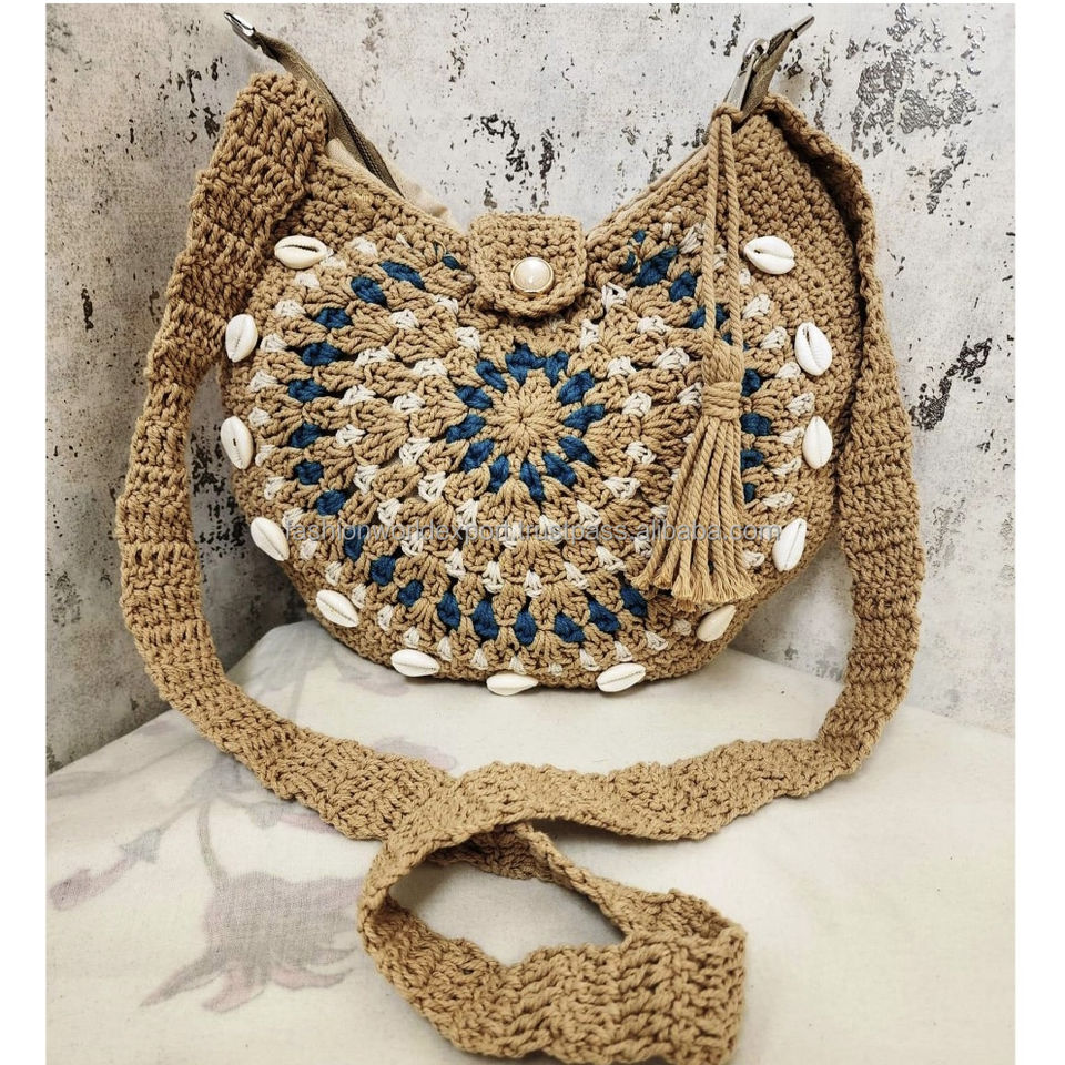กระเป๋าถักไหมพรมทำด้วยมือทำจากใยธรรมชาติมีลายมันดาลาแบบเกลียวและกระเป๋าสะพายไหล่สไตล์โบฮีเมียนทลมพร้อมพู่ตกแต่ง