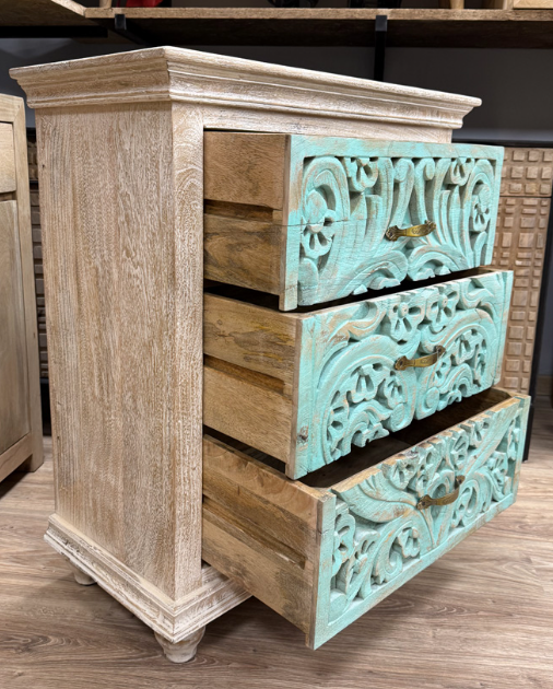 ตู้ลิ้นชักไม้เนื้อแข็งอินเดียสีเทอร์ควอยซ์แบบธรรมชาติ งานแฮนด์เมด แกะสลักสไตล์โอเรียนทอล สำหรับใช้ในบ้าน สำนักงาน ห้องนอน รับผลิตแบบ OEM