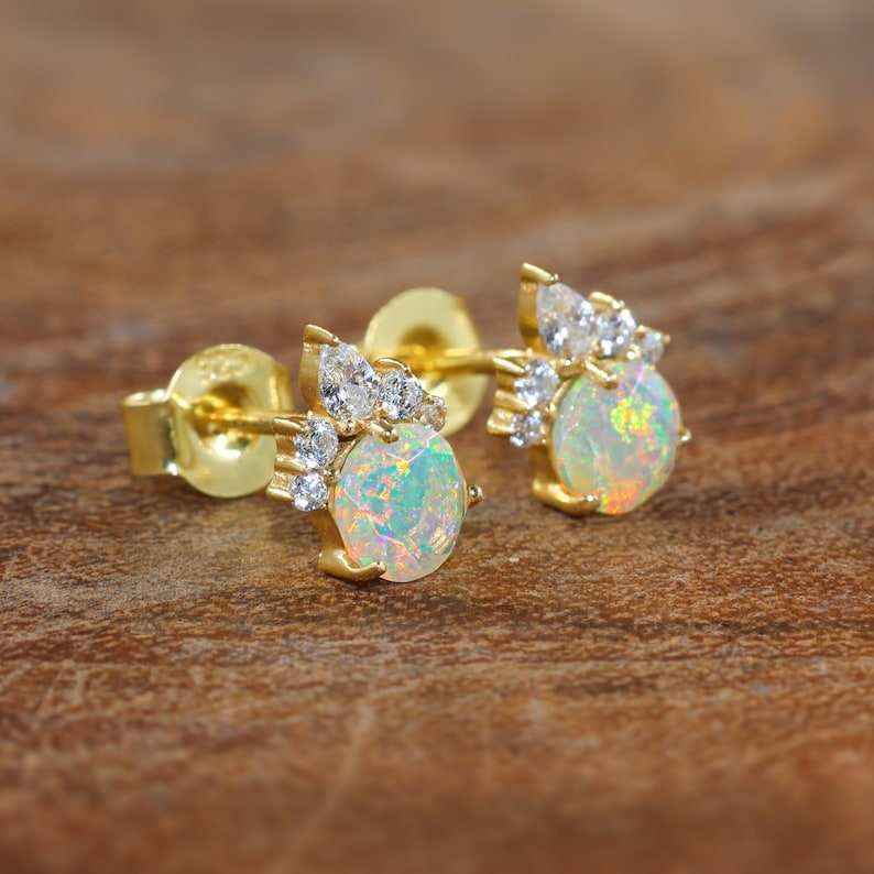 ต่างหูสตั๊ดโอปอลไฟธรรมชาติ925เงินสเตอร์ลิง14K ชุบทอง October เครื่องประดับอัญมณีแฮนด์เมด