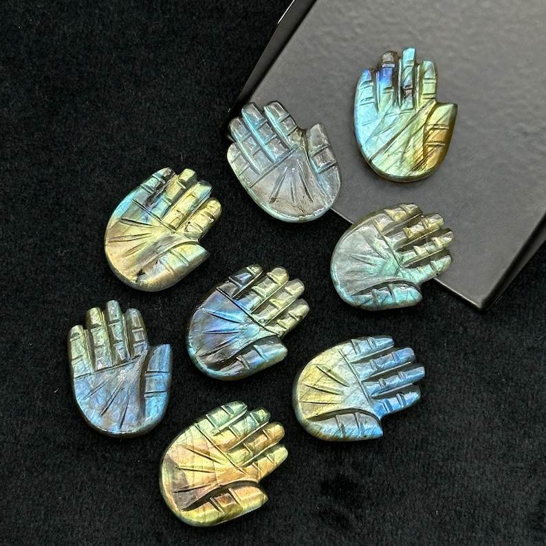 ลูกปัดรูปแฮมซ่าแกะสลักด้วยมือขนาด25มม. อัญมณีลาบราดอไรต์ธรรมชาติที่ฉูดฉาดทรงหลวมพลังบำบัด