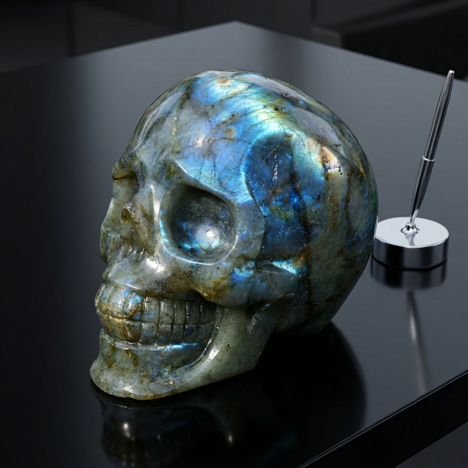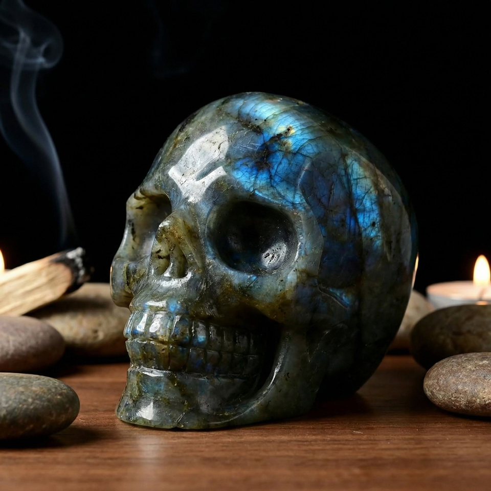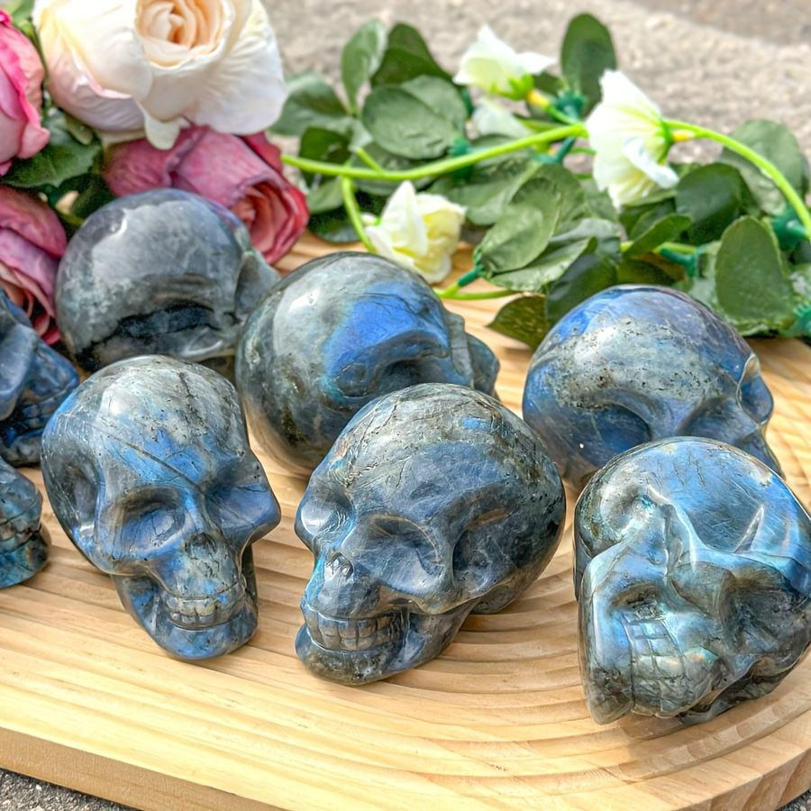 หัวกะโหลกลาบราดอไรต์ธรรมชาติแกะสลักด้วยมือ หัวกะโหลกควอตซ์คริสตัลแกะสลักสำหรับตกแต่ง
