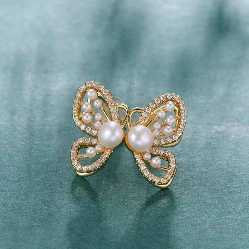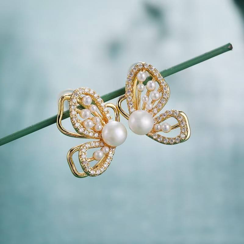 ต่างหูมุกน้ำจืดธรรมชาติรูปผีเสื้อ เงินแท้ S925 ประดับเพชรซิคอน ดีไซน์หรูหราทันสมัย