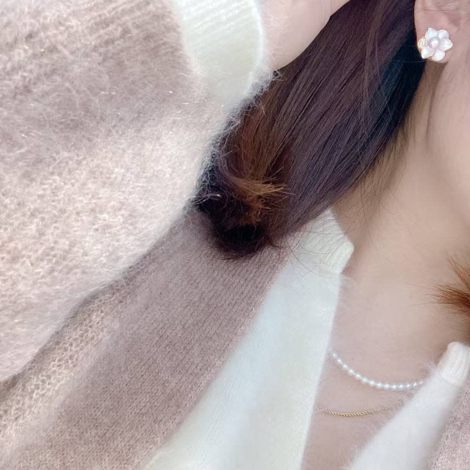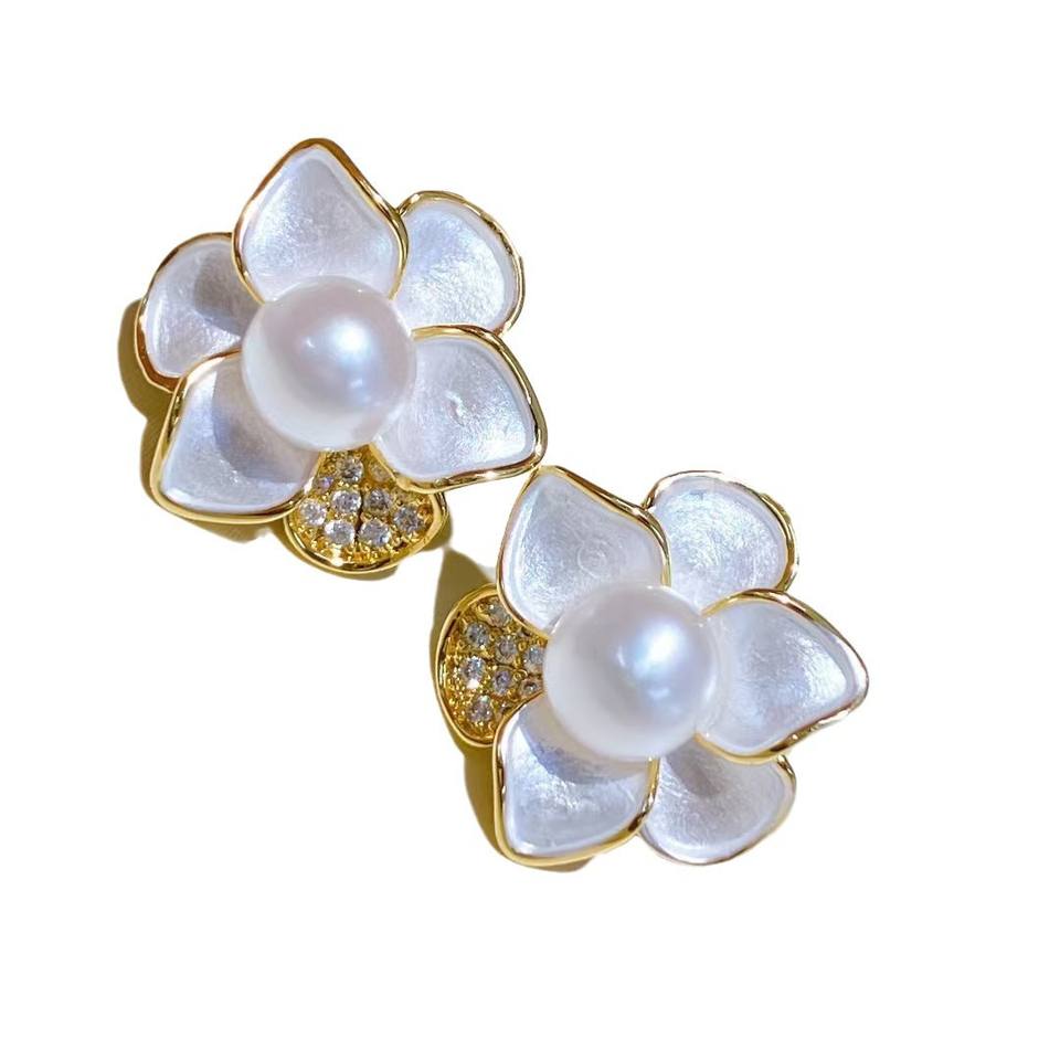 ต่างหูมุกน้ำจืดธรรมชาติรูปดอกคามิลเลีย ดีไซน์หรูหรา ประดับมุกและดอกไม้ ตัวเรือนเงินแท้ S925 ทันสมัย สง่างาม