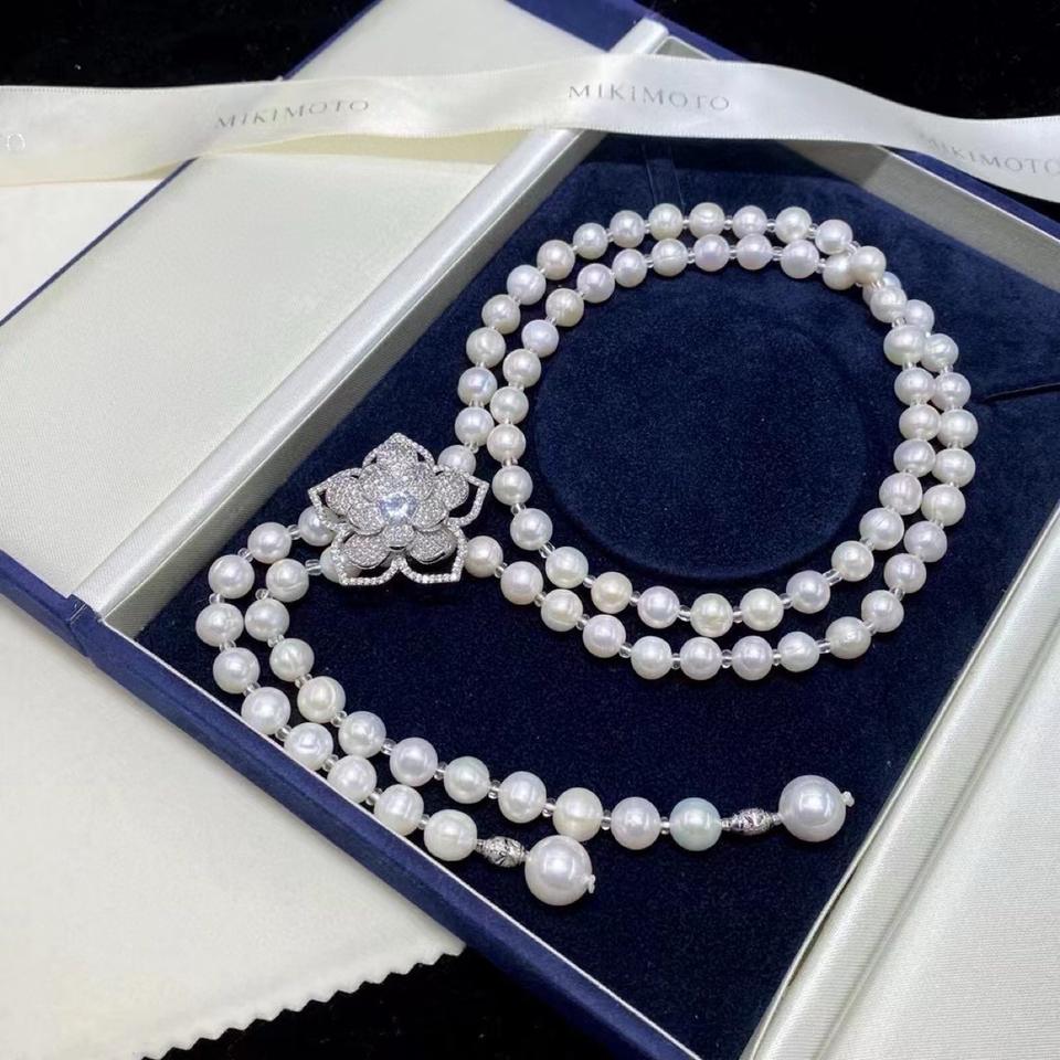 สร้อยคอมุกน้ำจืดธรรมชาติ 8-9 มม. 4-5 แทบจะกลม พร้อมโบว์ สร้อยคอแบบสองชั้น ความยาว 65 ซม.