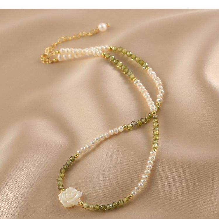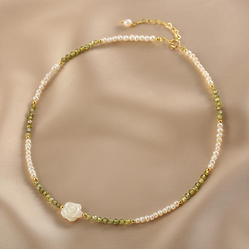 สร้อยคอมุกน้ำจืดธรรมชาติ ดีไซน์ดอกกุหลาบขาว สไตล์สาวหวาน จี้ลูกปัด Olivine Millet สร้อยคอแฟชั่น