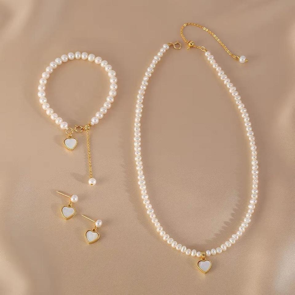 ชุดเครื่องประดับไข่มุกน้ำจืดธรรมชาติ รูปหัวใจสีพีช สร้อยคอ สร้อยข้อมือ ต่างหู พร้อมเปลือกหอยสีขาวลายผีเสื้อ ของขวัญเครื่องประดับชั้นดีสำหรับแฟนสาว