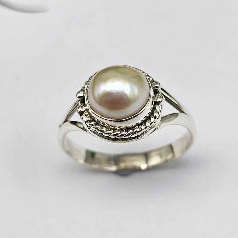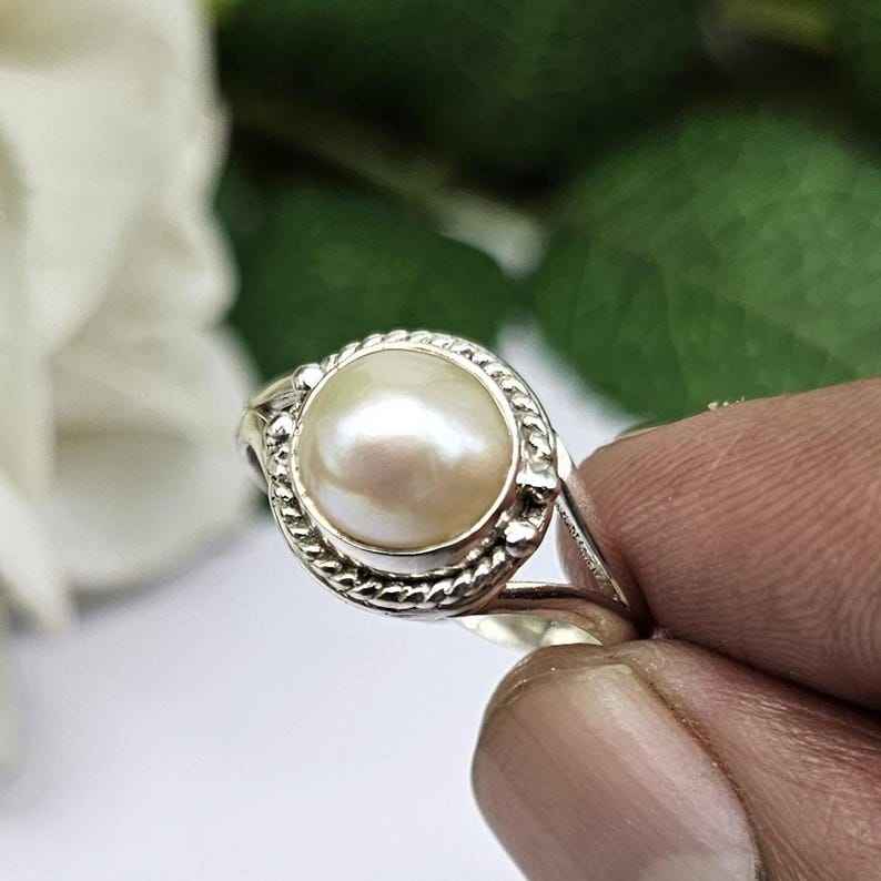 แหวนไข่มุกน้ำจืดธรรมชาติแหวนเงินสเตอร์ลิง925ไข่มุกสีขาวทำด้วยมือ