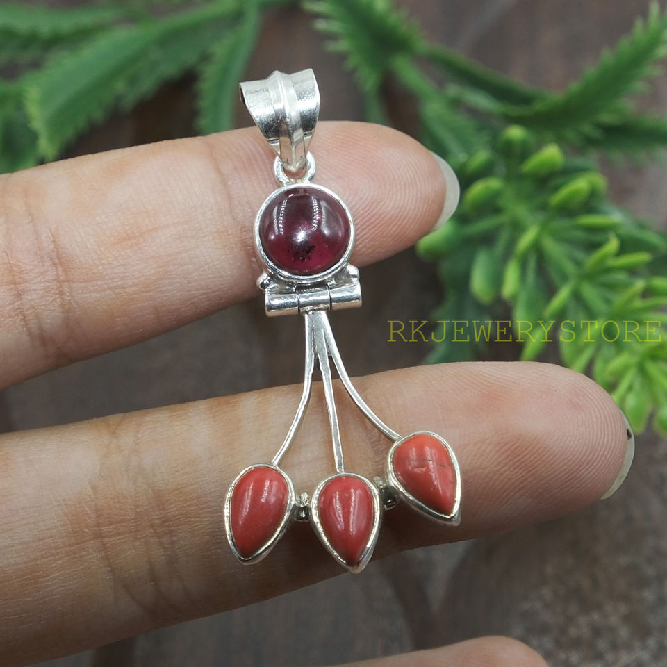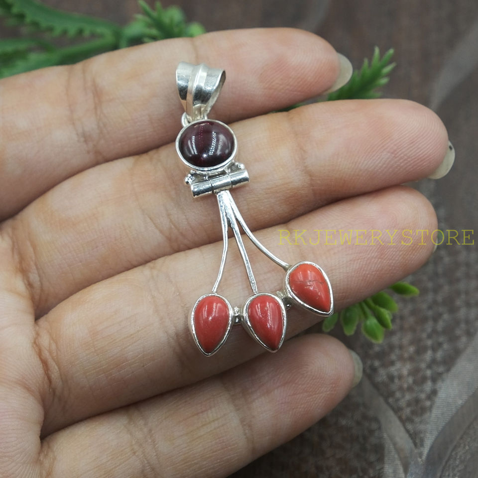 จี้ห้อยคอรูปหยดน้ำสามเม็ดประดับด้วยพลอยโกเมนสีแดงธรรมชาติและปะการัง ทำด้วยเงินแท้ 925 งานแฮนด์เมด สไตล์โบฮีเมียน ของขวัญสำหรับผู้หญิง