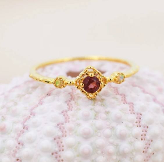 แหวนพลอยโกเมนและโอปอลธรรมชาติในตัวเรือนเงินแท้ 9250 หรือทองคำ แหวนพลอยโกเมนสีแดงธรรมชาติแบบกึ่งมีค่า ดีไซน์สไตล์วินเทจ