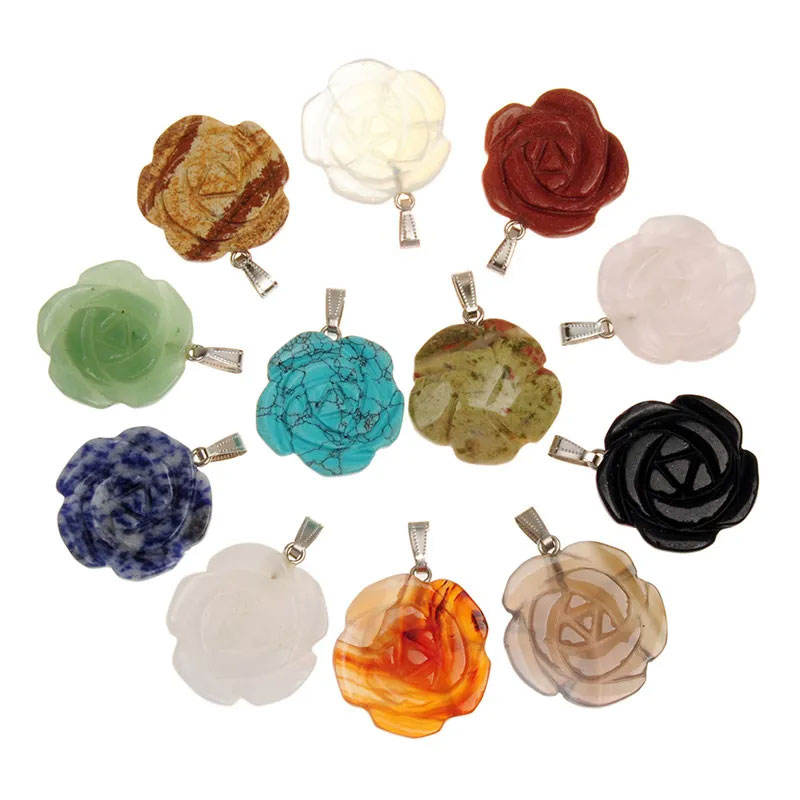 จี้รูปดอกกุหลาบแกะสลักจากอัญมณีธรรมชาติ หลายชนิด สำหรับทำเครื่องประดับขายส่ง