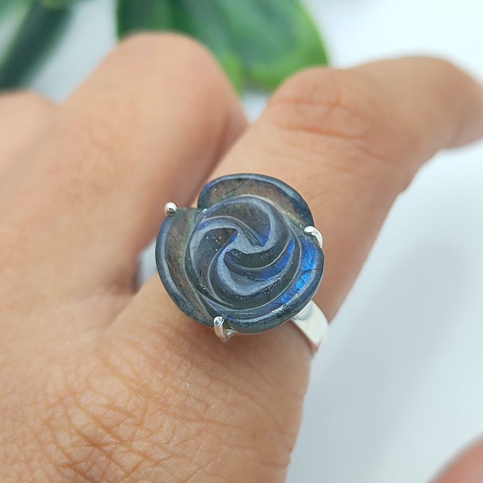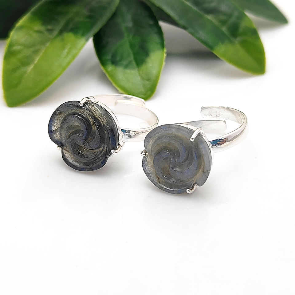 แหวนแกะสลักหินลาบราดอไรต์ธรรมชาติทำมือสำหรับผู้หญิงแหวนสายรัดตรง