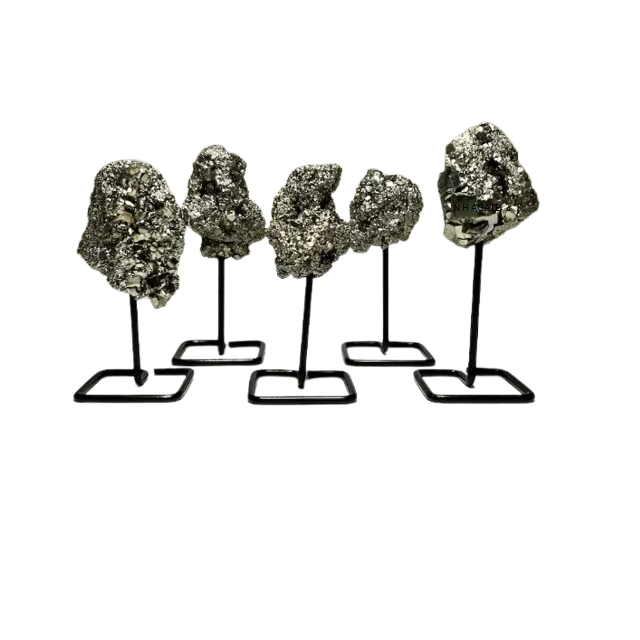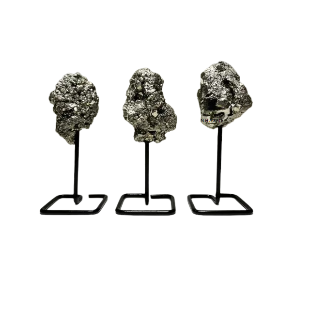 คลัสเตอร์ไพไรต์อัญมณีธรรมชาติบนขาตั้งโลหะสำหรับตกแต่งบ้านหรือตกแต่งสำนักงาน