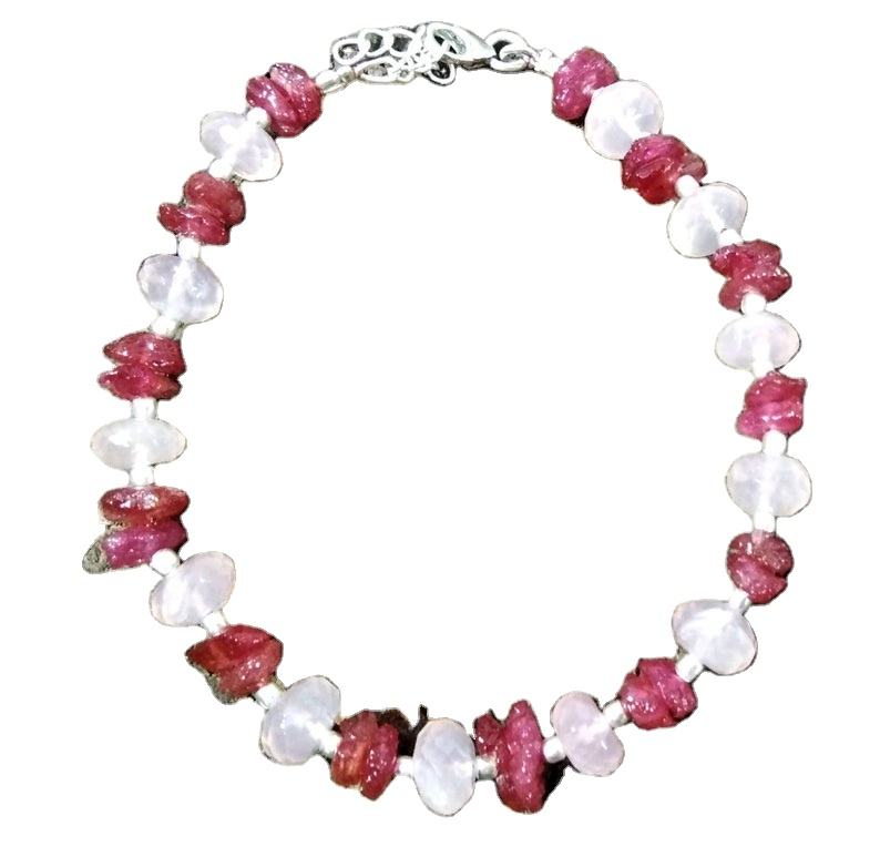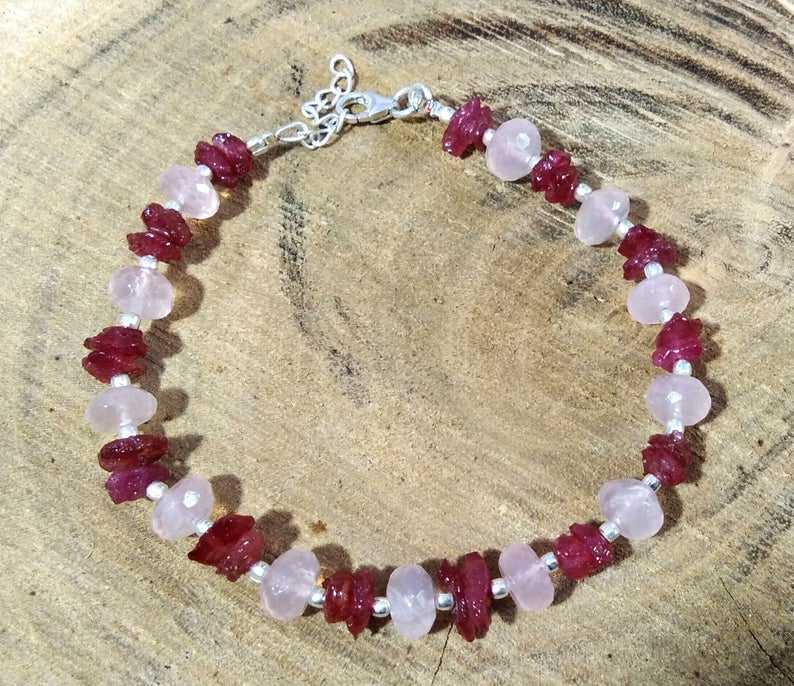 กำไลข้อมือเงินแท้ 92.5 ประดับด้วยพลอยทับทิมดิบและโรสควอตซ์ ความยาว 7 นิ้ว งานแฮนด์เมดสวยงาม