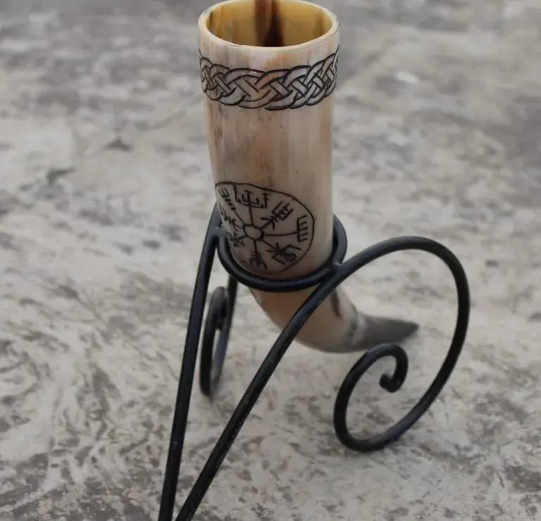 ฮอร์นดื่มไวกิ้งแท้จากธรรมชาติพร้อมขาตั้งโลหะแกะสลักสไตล์ทะเลมี้ดเอลของขวัญสำหรับปาร์ตี้คริสต์มาส