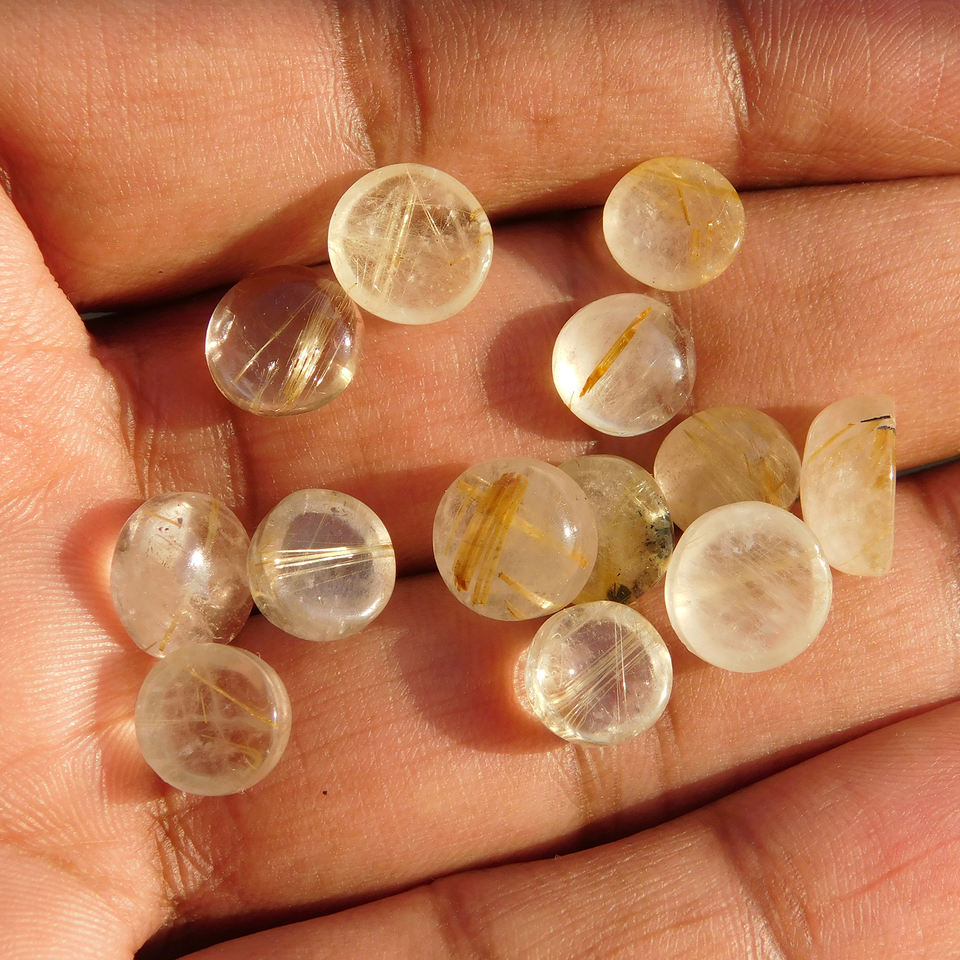 พลอยรูไทล์สีทองธรรมชาติ ขนาด 9x9 มม. ทรงกลมแบบคาโบชอง มีทุกขนาด ด้านหลังแบน สำหรับทำเครื่องประดับ พลอยหลวม