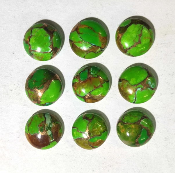 ทองแดงสีเขียวธรรมชาติเทอร์ควอยซ์ทรงกลม Flatback Cabochon เครื่องประดับอัญมณีทํา Mohave เทอร์ควอยซ์แหวนสร้อยข้อมือ Birthstone