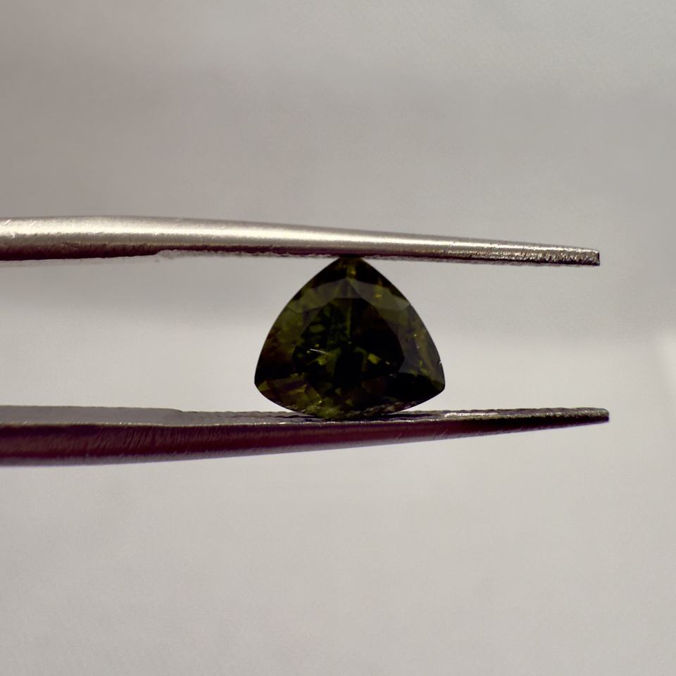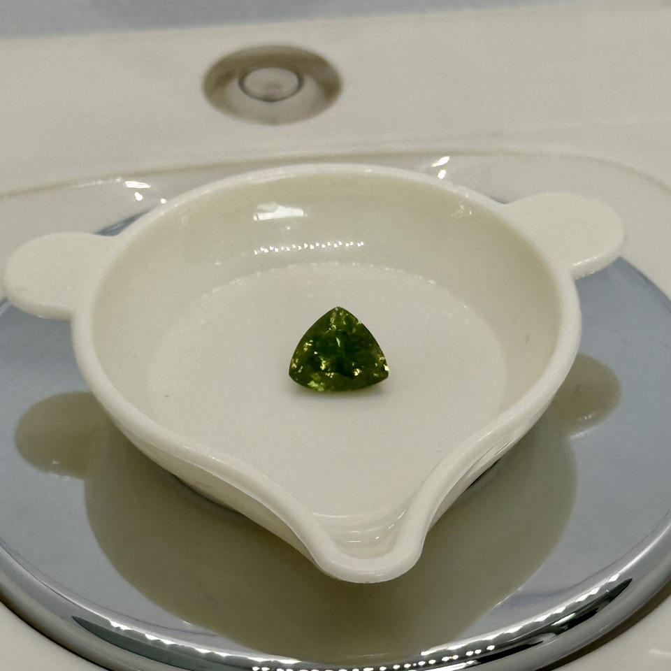 พลอยเพทายสีเขียวธรรมชาติจากศรีลังกา ทรงสามเหลี่ยมขนาด 6.5x4.1 มม. น้ำหนัก 1.32 กะรัต สำหรับทำเครื่องประดับ
