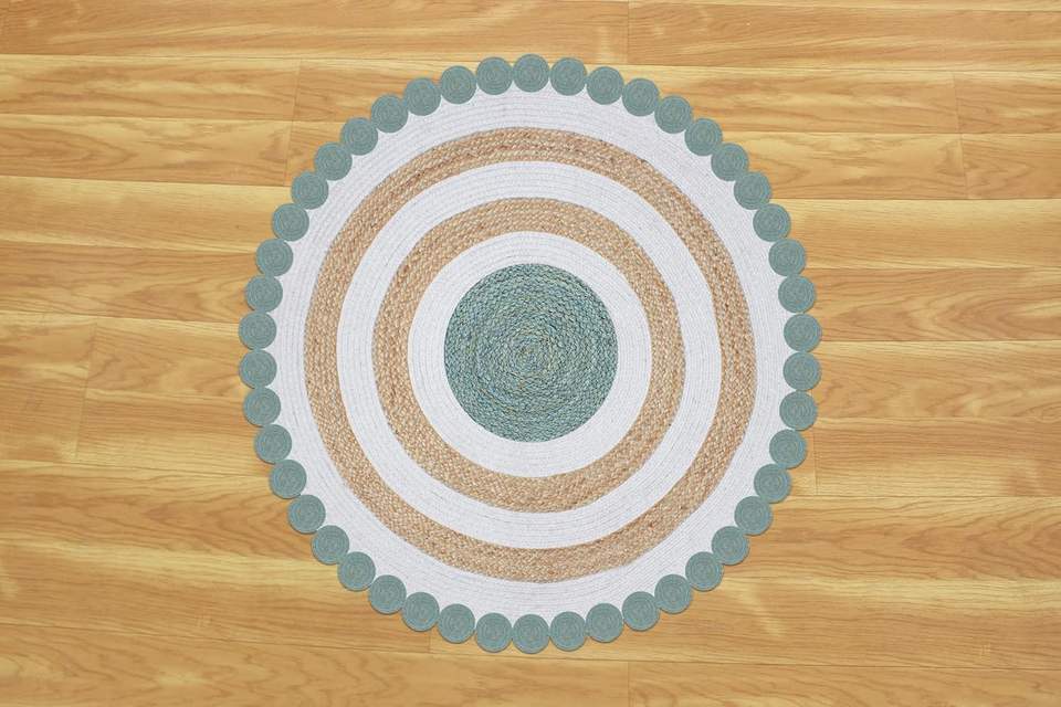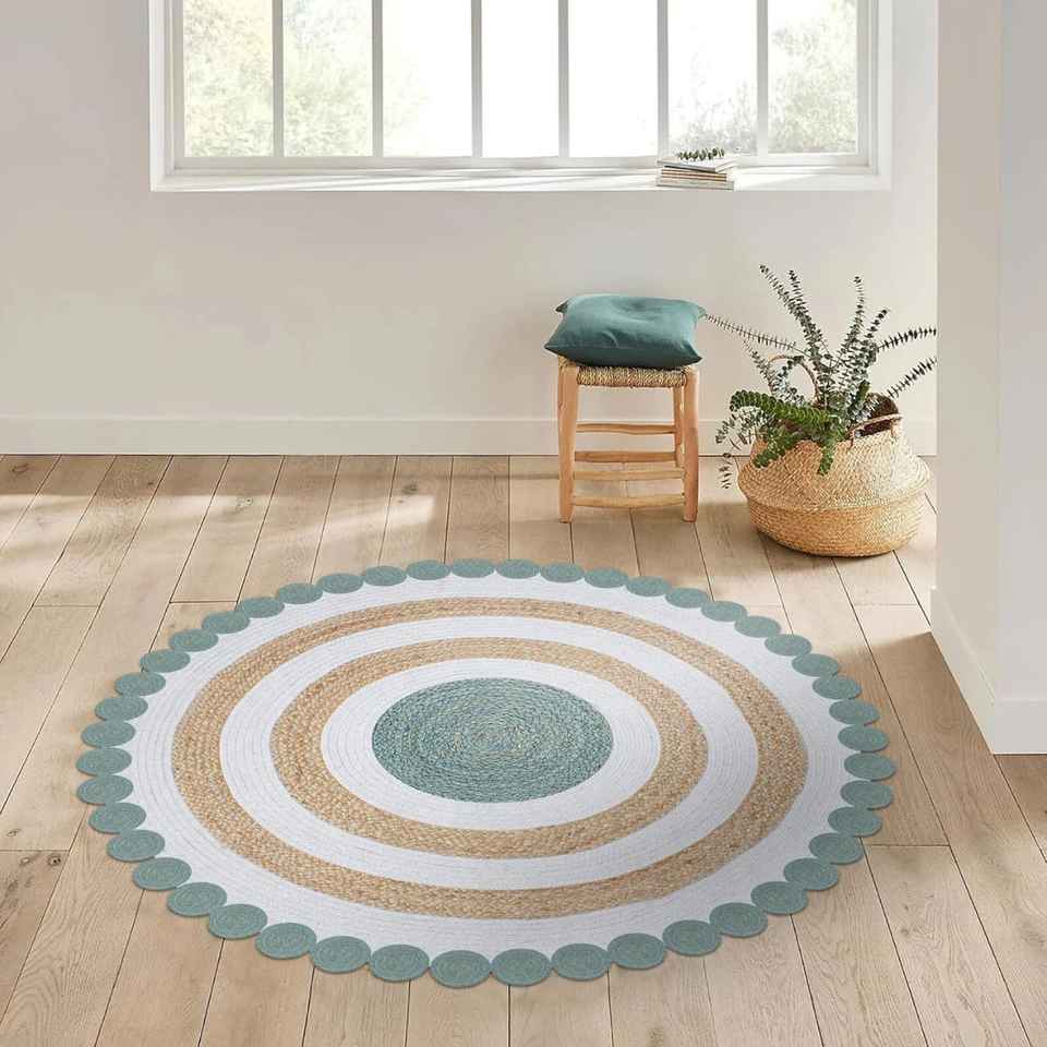 พรมปูพื้นทรงกลมทำจากปอกระเจาถักมือธรรมชาติ ผสมผสานวัสดุผ้าฝ้าย เป็นมิตรต่อสิ่งแวดล้อม เหมาะสำหรับห้องนั่งเล่นและทางเดิน