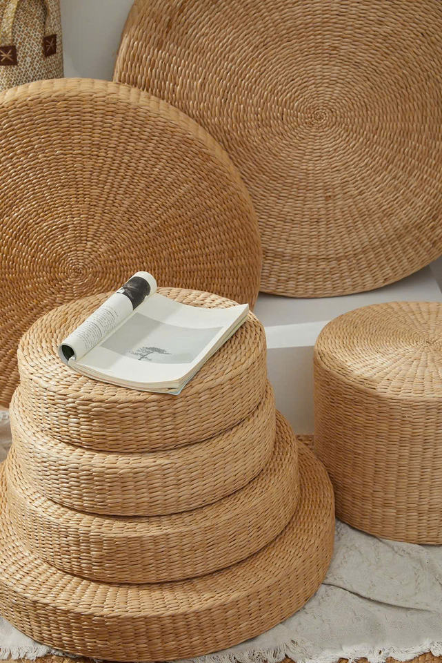 ชุดโต๊ะและม้านั่งทรงกลมผักตบชวาทำด้วยมือธรรมชาติเป็นมิตรกับสิ่งแวดล้อมสำหรับแนวคิดการตกแต่งแบบชนบท