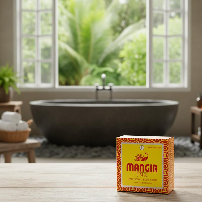 สครับขัดผิวธรรมชาติจากสมุนไพร Mangir JMK ผลิตภัณฑ์ดูแลผิวแบบดั้งเดิมของอินโดนีเซีย สำหรับใช้ในสปาและที่บ้าน ใช้ได้กับทุกสภาพผิว