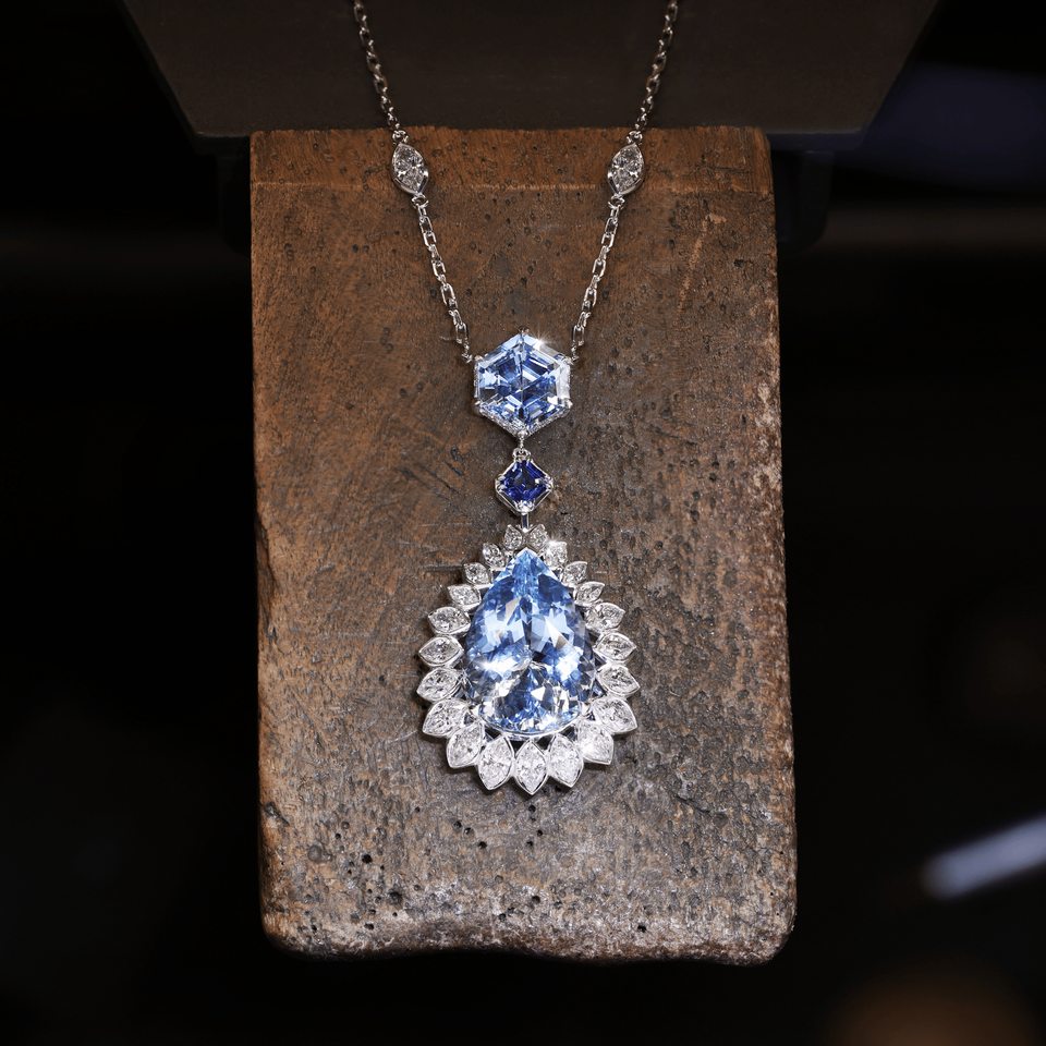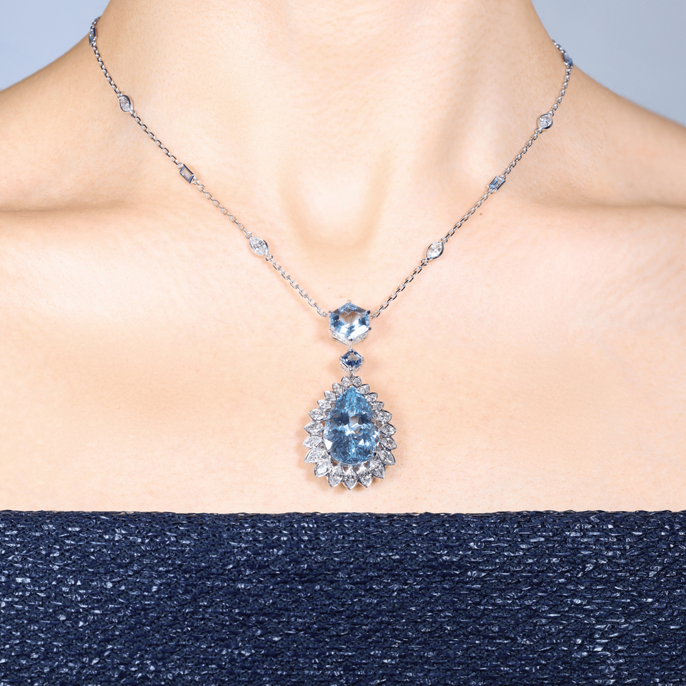 สร้อยคอทองคำขาว 18k ประดับพลอยอควอมารีนทรงหกเหลี่ยมคุณภาพสูงจากอิลูกา และพลอยไพลินสีน้ำเงินซีลอน พร้อมเพชรธรรมชาติ