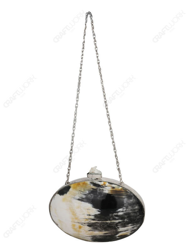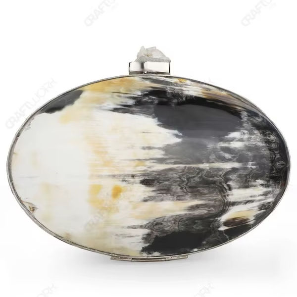 กระเป๋าคลัทช์ทรงวงรีทำจากเขาสัตว์ธรรมชาติ พร้อมหัวจับคริสตัลดิบ กรอบสีเงิน หรูหราโดดเด่น เหมาะสำหรับขายส่งและรับผลิตแบบ OEM